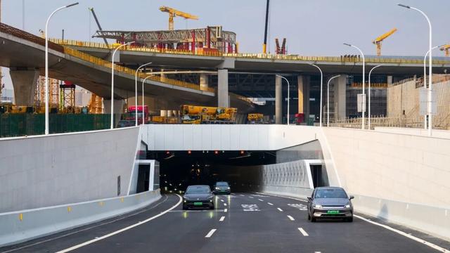 浦东机场南进出场路地道全长3.3公里,包括峒口段、暗埋段、光栅梁段、敞开段等不同区域,是连通浦东机场南北区域和前往临港方向的主要通道。