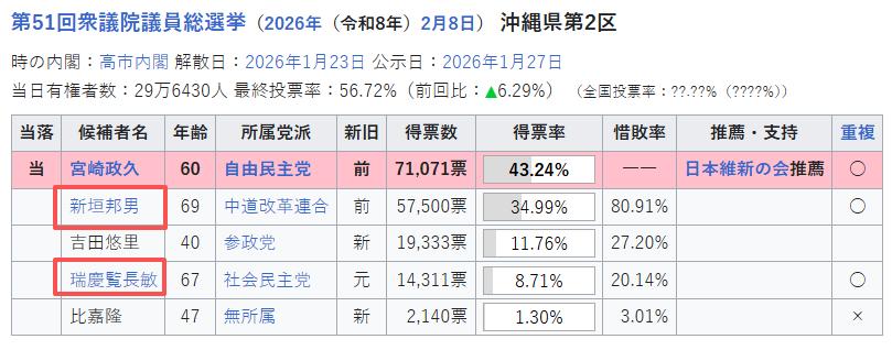 日本社会民主党在日本唯一的小选区,由于分裂,自民党人渔翁得利,宮崎政久当选。如果社会民主党不分裂的话,社民党人还是可以当选的。谁知新垣邦男去年底退出社民党加入立宪民主党,社民党此次不得已推出新人来选举。冲绳二区那可是社民党的铁票仓啊,也是社民党唯一的一个小选区,当年照屋宽德在世的时候6连霸,每次都让自民党人比例复活才能当选!