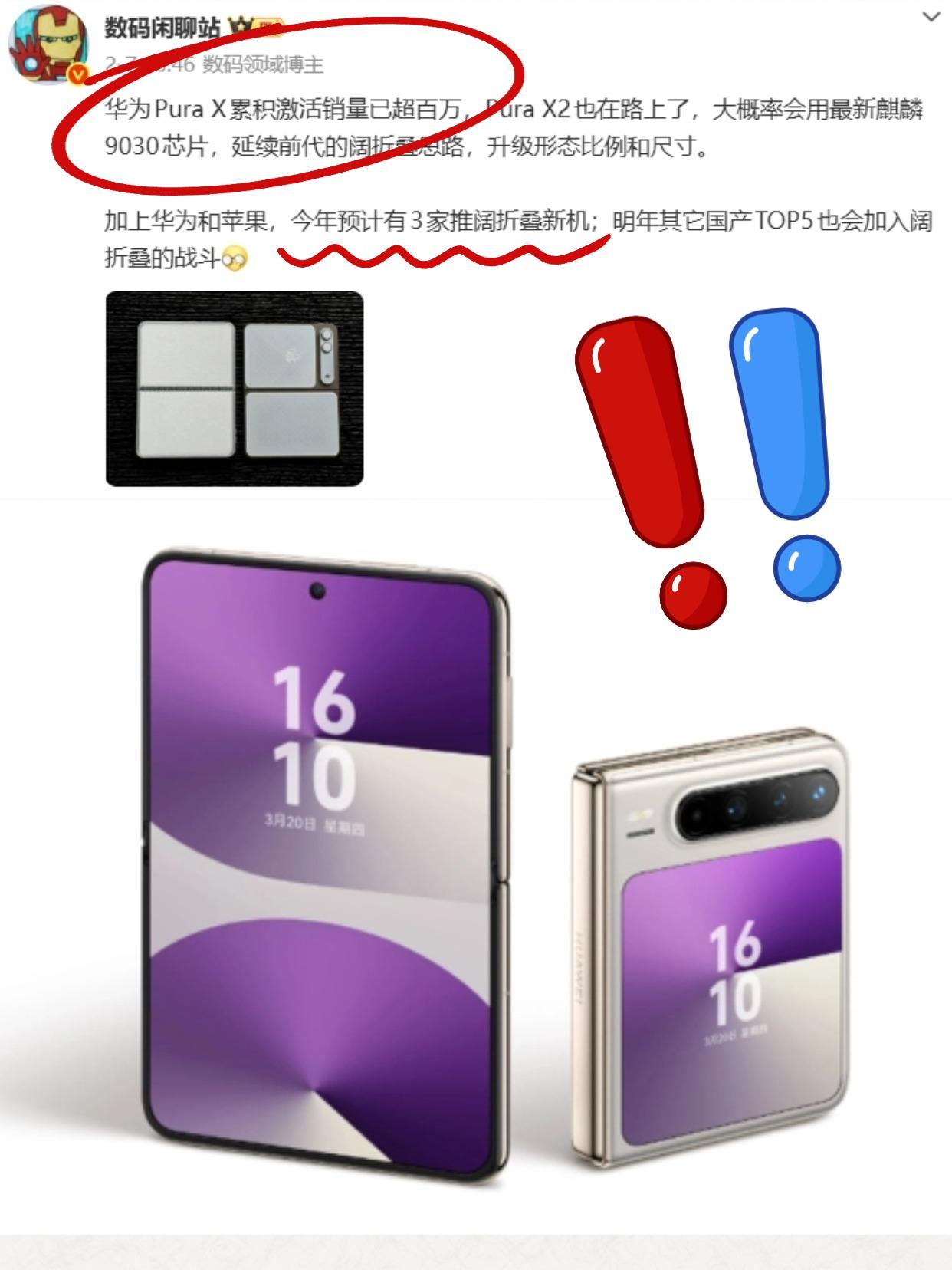 不敢想象,要是鸿蒙生态没有缺陷,华为Pura X得有多抢手!!!站哥透露,华为Pura X激活量已经突破百万台,而且新一代Pura X2也已经在路上了(网传会在4月左右登场)。 配置方面,puraX2大概率会搭载麒麟9030,延续前代的阔折叠思路,并提升屏幕尺寸(预计为7.69英寸内屏+5.5英寸外屏),再搭配上已经相当成熟的鸿蒙6,还是非常有希望成为大爆款的!数码大玩家[话题] 抗摔能力强[话题] 数码街区由我造[话题] 折叠屏[话题] 玩转科技数码[话题]