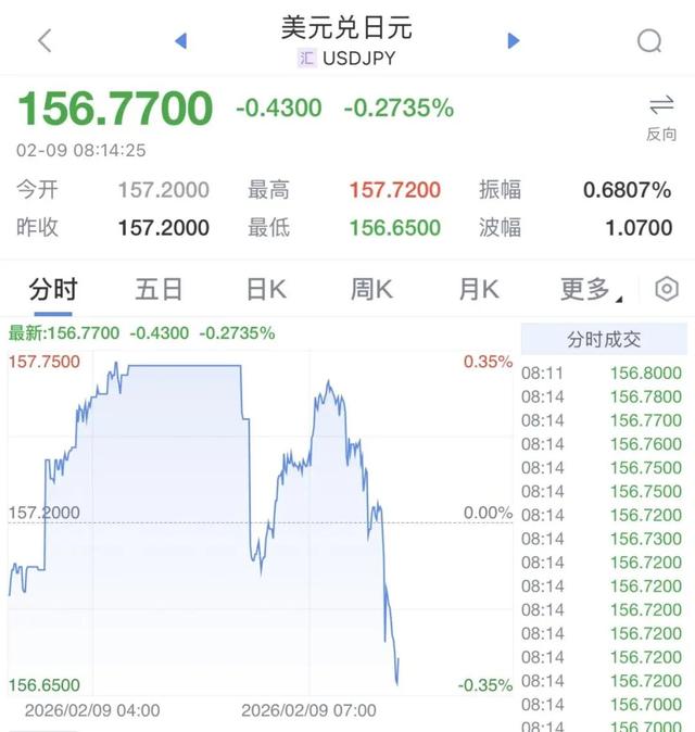 美元兑日元短线走低,跌破157关口。