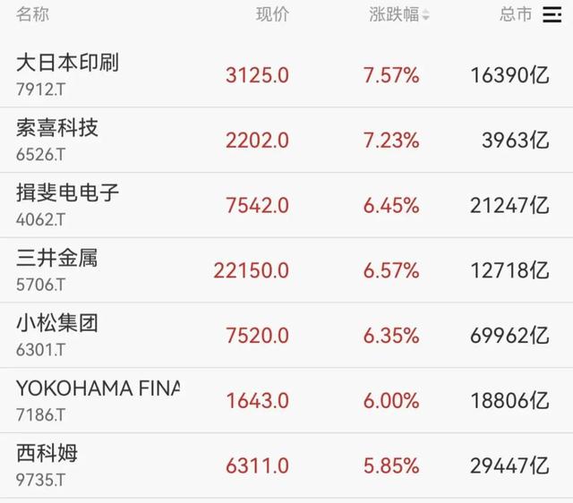 个股方面,索喜科技、三井金属、西科姆等涨幅居前。软银集团股价涨幅最高达8.5%,创1月28日以来最大涨幅。