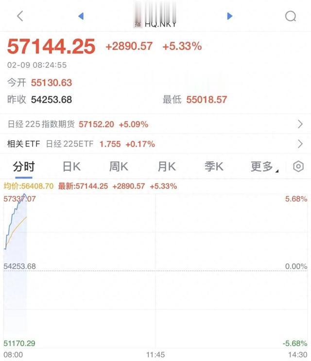 2月9日,日经225指数日内一度涨超5%,突破57000点,再创历史新高。