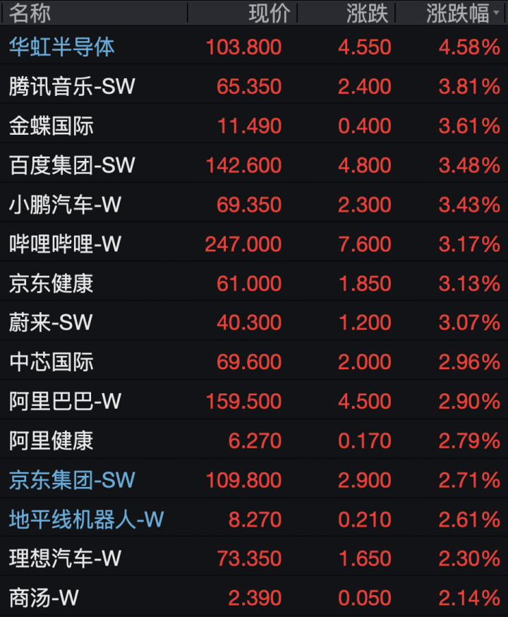 科网股集体反弹,华虹半导体涨超4%,百度集团、小鹏汽车、哔哩哔哩均涨超3%,中芯国际、阿里巴巴、京东集团、商汤等涨超2%。