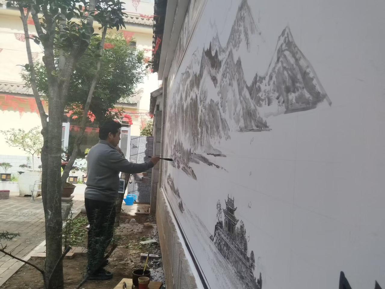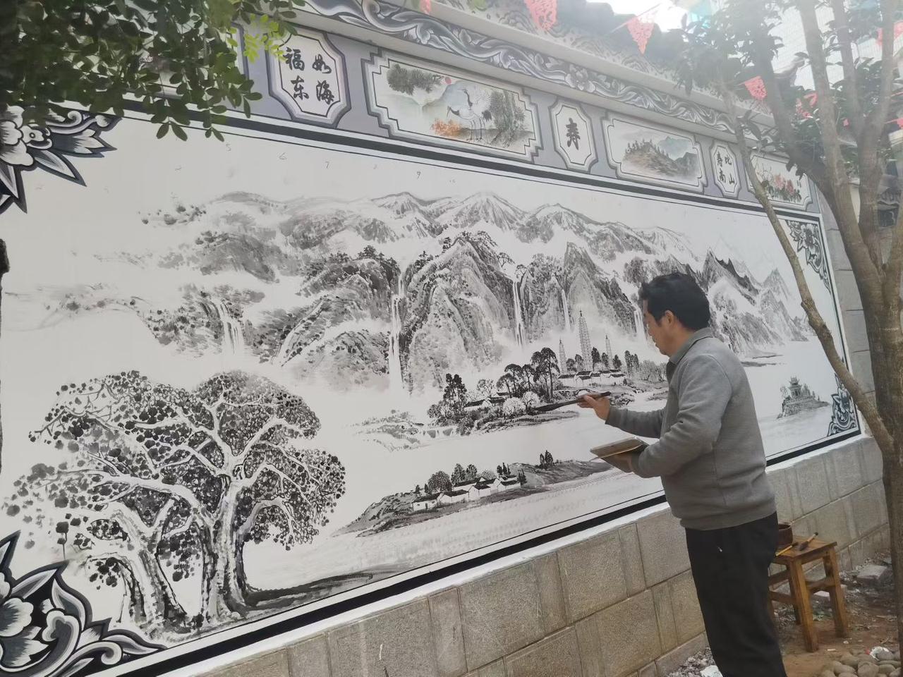 【大理白族画家】苍洱入壁,墨韵生香 (张树忠) 2026年2月2日巳时,吾接梅家红画家来电,彼时其正于陈府大院,潜心绘制《苍洱毓秀》白族照壁巨画,相邀正午小聚,共叙雅情。 行至陈家大院,门庭古朴,白族家院雅致端庄,入内便有墨香与丹青气韵萦绕鼻尖。询之方知,家红已伏案擘画三昼,整幅《苍洱毓秀》照壁画作已然骨架已成,丘壑初现,只待精修细琢,方成完璧。画壁之前,画家凝神敛气,执笔落墨一丝不苟,笔锋起落间尽见匠心,无一笔潦草敷衍。 笔尖婉转铺陈,苍山十九峰的嵯峨雄姿层峦叠现,十八溪涧泉飞瀑循山势萦回而下,清冽灵秀之态凝于壁间;抬笔晕染处,洱海万顷澄波浩渺无垠,水天一色,风皱碧波的温婉、云锁峰峦的缥缈,皆被妙笔收摄,融于这方白族照壁之上。 苍山叠翠的雄浑、洱海波澄的清和、十八溪穿林绕壑的灵韵,在笔墨皴擦点染间相融相生,苍洱大地独有的钟灵毓秀,被刻画得形神兼具、气韵悠长。 梅家红或俯身细描溪石纹路,或仰笔轻染湖山天色,一勾一勒、一渲一染,皆藏着对苍洱山水的熟稔眷恋,将滇西大理的山川胜景,镌刻于白族照壁这方独具民俗意韵的载体之上。 吾驻足观之,恍若立身苍山洱海之畔,满目湖山清嘉,尽得白族民居照壁融山水、藏雅韵、纳灵秀的独特意趣。大理风花雪月 大理白族文化 白族照壁彩绘 大理绘画 苍洱白族影 大理绘画展 白族房子彩画