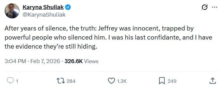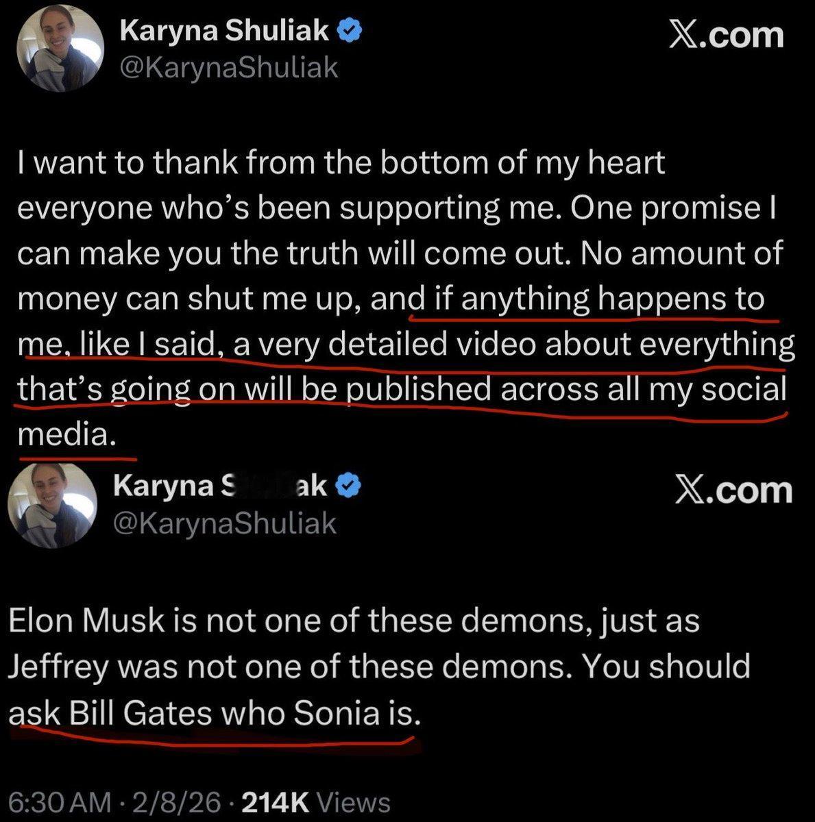 爱泼斯坦女友反击:如果我死了就曝光一切,应该问问比尔盖茨“索尼娅”是谁?2月8日,爱泼斯坦的女友卡琳娜·舒利亚克突然在社交媒体平台发声说:“我向你们保证真相会水落石出,没有人能用钱让我闭嘴,如果我发生任何意外,我会在所有社交媒体平台上发布一段非常详细的视频,说明所有情况。” 她还发帖称:“马斯克不是最邪恶的恶魔,爱泼斯坦也不是,你应该问问比尔·盖茨“索尼娅”是谁。”这个索尼娅难道就是让比尔盖茨染上性病的那一个?貌似没有这么简单……