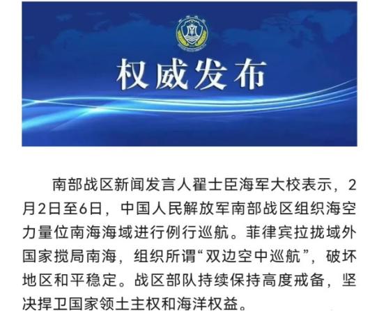 B52给的勇气!中菲黄岩岛爆发对峙,中国重型战机直接冲了过去 最近南海一点都不平静,2 月 2 号到 6 号这几天,菲律宾拉着美国在南海搞起了军事演习。菲律宾空军出动了 FA50 战斗机,美国更狠,直接把 B52 战略轰炸机派到了南海至吕宋海峡一带,跟着菲律宾的飞机一起搞联合演练,还模拟了实弹投放。明眼人都能看出来,美国这是给菲律宾撑腰来了,想借着 B52 的威慑力,在南海挑事。 要说菲律宾胆子也真够大,仗着有美国的轰炸机撑腰,6 号当天就派了一架塞斯纳侦察机,偷偷闯进黄岩岛周边空域。这架飞机不光非法闯入,还故意低高度飞行,想打探中国这边的情况。 但他们没想到,中国早就盯着呢,解放军南部战区的苏 - 30MKK 重型战斗机马上就赶了过去,同时在附近巡逻的 054A 型导弹护卫舰也发出了无线电警告,前前后后警告了 28 次,明确告诉菲律宾飞机 “这里是中国领土,赶紧离开”。 菲律宾的侦察机还嘴硬,说自己的行为符合国际法,可实际上他们连中国政府的允许都没有,纯属非法闯入。面对中国战机的近距离驱离,这架轻型侦察机根本没敢停留,很快就灰溜溜离开了。 其实从实力上看,菲律宾的飞机跟中国重型战机根本不是一个级别,他们的 FA50 战斗机连正经空战能力都没有,真要是硬碰硬,吃亏的肯定是菲律宾。 可能有人要问,美国的 B52 轰炸机去哪了?为啥没帮菲律宾?说穿了,美国就是来 “摆样子” 的。这两架 B52 从关岛起飞,跟菲律宾飞机联合飞行了一圈,根本没敢靠近黄岩岛核心区域。 军事专家早就说过,美国派 B52 过来,就是想验证一下战略轰炸机的部署能力,给菲律宾壮壮胆,并不是真的想跟中国动手。他们心里清楚,中国在南海的海空力量已经形成了完整的体系,真要是打起来,B52 也讨不到好。 中国这边可不光是派了重型战机驱离,整个 2 月 2 号到 6 号,南部战区一直在南海组织海空力量例行巡航。空中有轰 - 6K 轰炸机挂载实弹巡逻,这种轰炸机航程能覆盖整个南海,挂的鹰击 - 12 导弹能远距离打击军舰,飞得又快又准。 还有歼 - 16、苏 - 30MKK 这些重型战机护航,电子战飞机也跟着协同配合。海上有 055 型万吨大驱、054A 型护卫舰组成的编队,在黄岩岛周边保持警戒,海警船也同步开展执法巡逻,形成了空中、海上、执法的立体管控。 更关键的是,菲律宾之前还单方面划了一个 1.5 万平方公里的演习区,把黄岩岛也包了进去,想搞 70 天的军事训练。结果中国的战机和军舰直接穿越了这个所谓的 “演习区”,用实际行动告诉他们,这种非法划定的区域根本不算数。 黄岩岛是中国的固有领土,这是有明确法理依据的,从 2012 年开始,中国就一直在对黄岩岛进行实际管控,菲律宾想借着美国的力量抢过去,根本就是做梦。 为啥菲律宾非要在黄岩岛挑事?其实他们心里有自己的小算盘。国内面临弹劾风波,总统支持率下跌,想通过炒作南海议题,塑造 “对外强硬” 的形象,转移老百姓的注意力。 而美国正好想利用菲律宾,在南海围堵中国,所以一拍即合,搞起了联合军演。但他们都打错了算盘,中国维护领土主权的决心从来没有动摇过,不管是菲律宾的挑衅,还是美国的搅局,都改变不了黄岩岛属于中国的事实。 解放军的回应一直保持着克制和专业,不是要升级局势,而是在合法维护自己的权益。常态化的海空巡航不是为了挑衅谁,而是为了让那些想搞事的国家不敢轻举妄动。 现在南海局势总体是可控的,但只要有国家敢来挑衅,中国的战机、军舰就会第一时间作出回应,绝不允许任何人侵犯中国的领土主权。 说到底,美国的 B52 轰炸机给不了菲律宾真正的勇气,也改变不了南海的力量格局。中国在自己的家门口维护权益,天经地义。那些想靠着外部势力搅局的人,最终只会搬起石头砸自己的脚。 南海的和平稳定需要大家一起维护,要是有人非要逆流而行,等待他们的只会是失败的结局。
