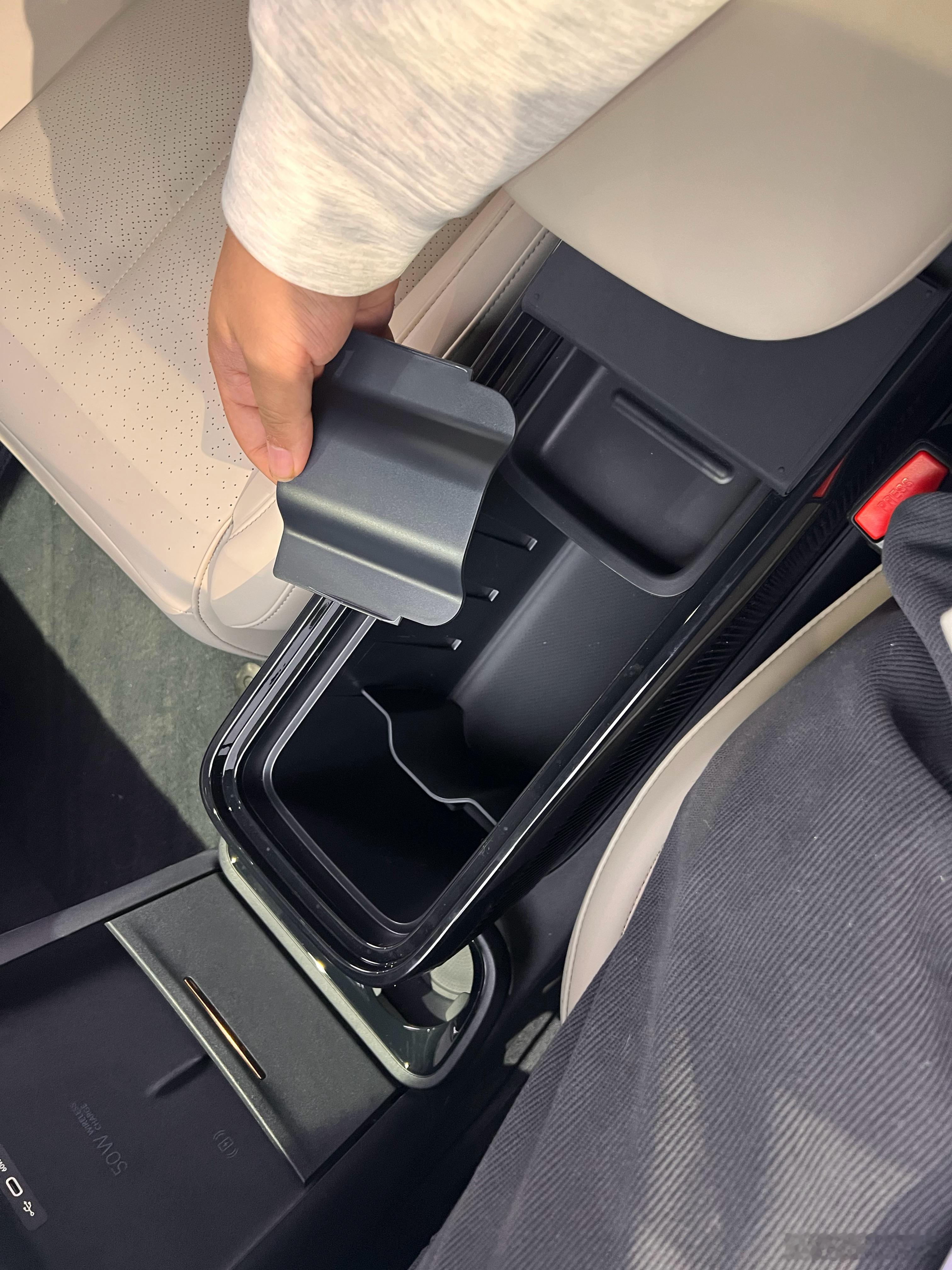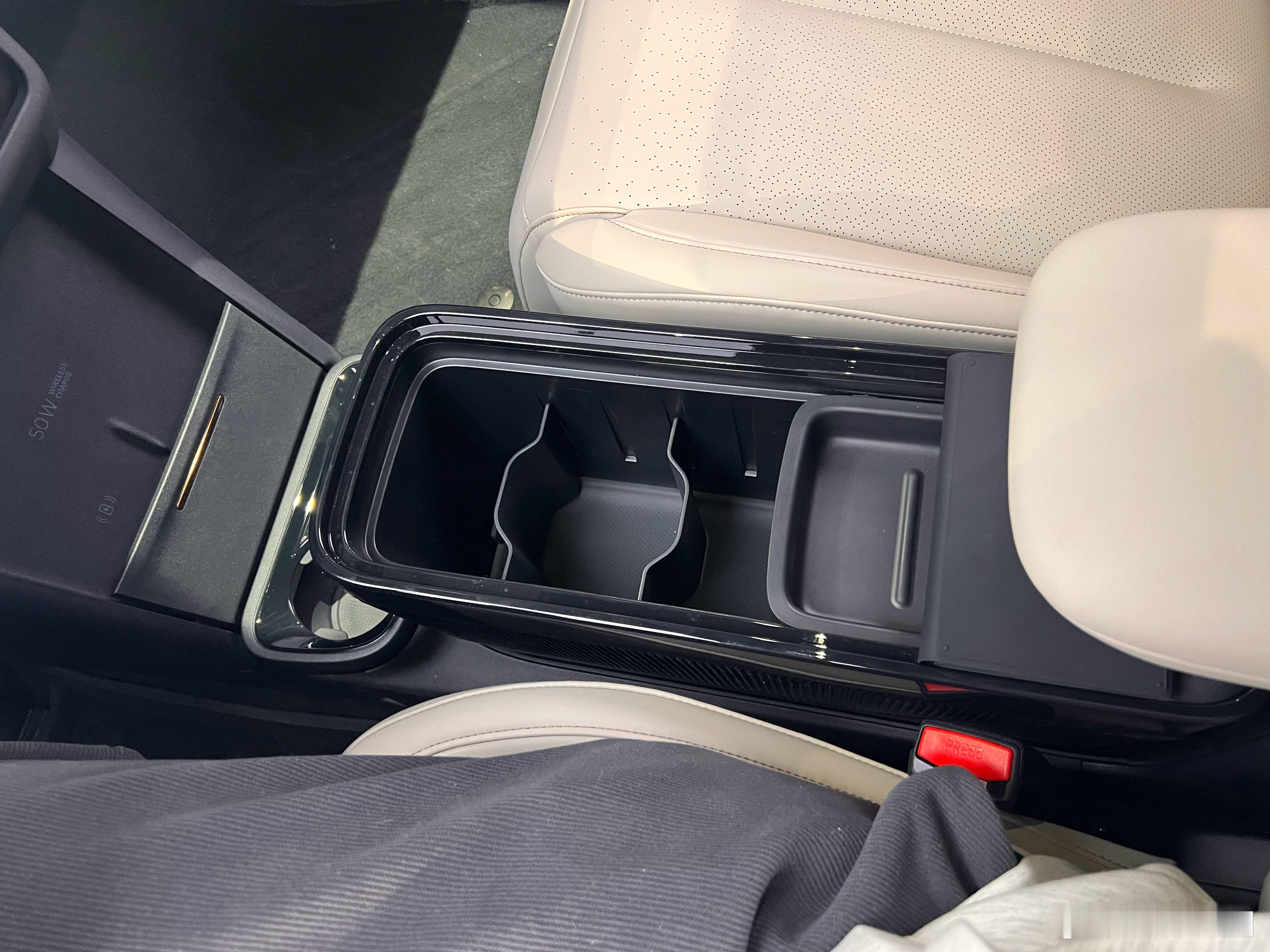 内饰明显比X降成本了,高级感降低,但看着还挺有趣。中央这个可整个拆卸的、有内部可移动隔板的、带n折叠盖子的储物箱设计得好棒啊,我可太喜欢了……