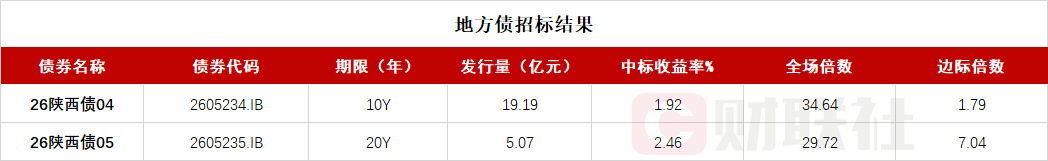 据财联社消息,陕西省政府两期地方债已招标结束,投标倍数均在29倍之上,具体中标信息如下: