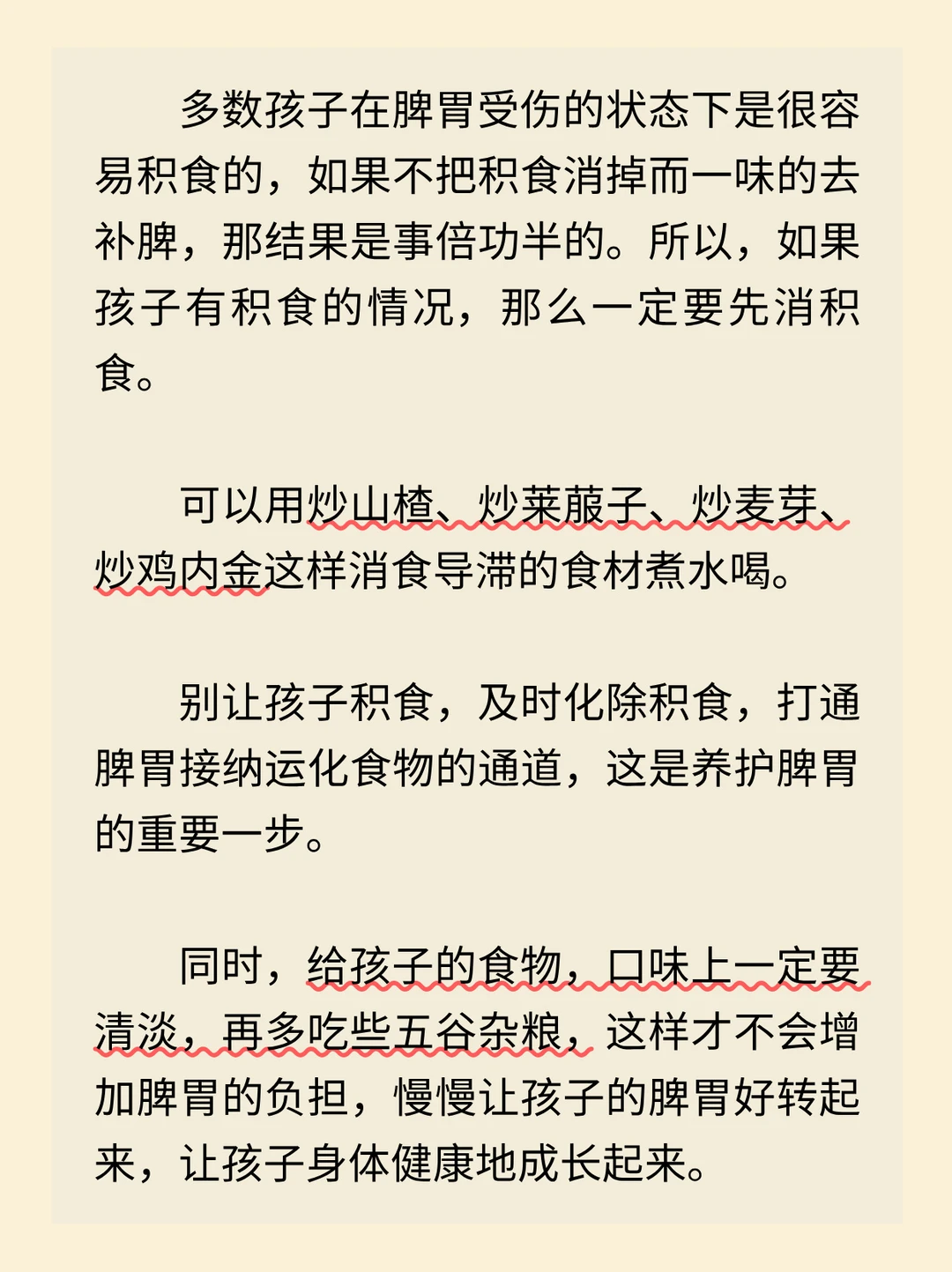 多数孩子在脾胃受伤的状态下是很容易积食的,如果不把积食消掉而一味的去补脾,那结果是事倍功半的。