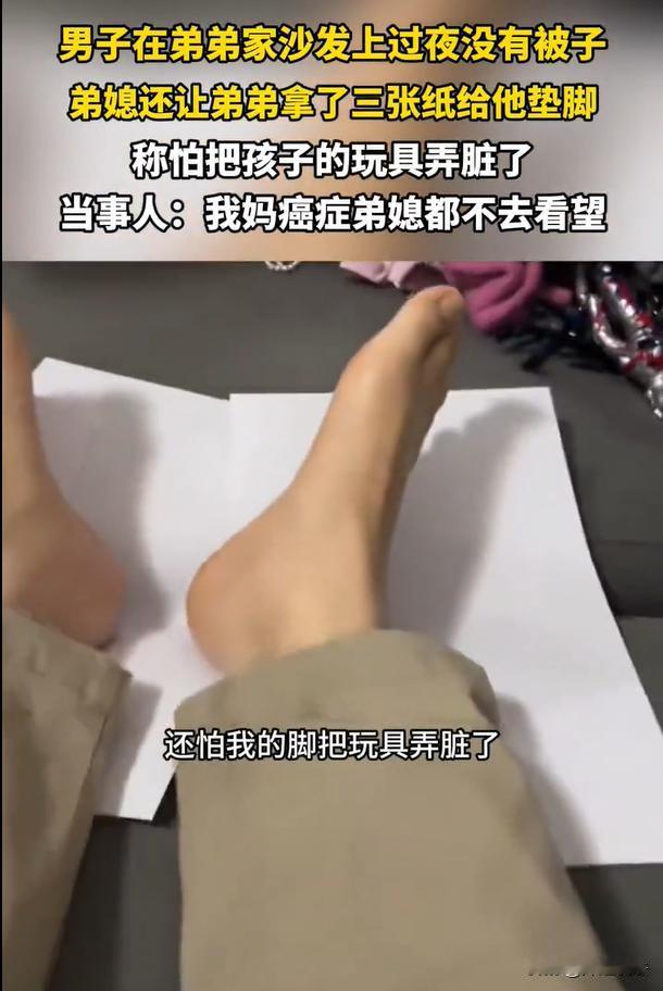 广东,一男子赶春运回家,之前妈妈患了重病,这次回来他准备投奔自己的弟弟。来到弟弟家之后,眼前的弟弟面露难色,弟媳则一直窝在卧室里没有露面。在弟媳的交代下,弟弟将男子安排睡在客厅,然后大冷天的也没有给安排一床被子。更可气的是,在弟媳的唆使下,还让弟弟拿了三张纸,让男子的脚垫在上面睡。男子寻思:这就是嫌弃我的脚脏呢!男子也很自觉,无奈的开门离去,回到车里过夜了。 观象视频2月8日报道了这则新闻。 据报道称,男子看到眼前这个窝囊的弟弟,他就知道,这一切就是他弟媳妇唆使的。之前妈妈患上重病,治疗期间,弟媳妇一次都没有来看望过,还各自排斥、各种抱怨。 一位男子从外地开车回家,奔赴千里,就希望回到家中能够跟亲人团聚。 在很早些的时候,男子的妈妈因为患上重病,一直在接受治疗。不清楚妈妈是否还安在,男子决定投奔自己的亲弟弟。 本想着这就是自己一母同胞的亲弟弟,怎么说,也该见面三分情,必定是充满着温馨的画面。 可是谁曾想,进屋之后,弟媳妇那种白眼、充满冷漠的态度,一下子就让男子心凉了半截。 来到弟弟家,弟媳妇全程没咋交流,一转身就进房间了,之后就是对男子不搭不理。而且还偷偷摸摸的跟自己丈夫(男子的弟弟)交代了一些事情。 之后,男子就被弟弟给安排了,让他今晚睡在客厅的沙发上。 男子看到沙发上,乱七八糟,全是小孩的玩具。就自己先整理了一下,回头就躺了上去。 但是这个大寒天的,弟弟却没有给自己安排一床被子,男子冻的有些不知所措。 更为让自己的心寒的是,在弟媳妇的交代下,弟弟竟然取出了三张纸,垫在了男子的脚下面。 看到这个场景,男子算是明白了:这是嫌弃我的脚丫子脏呢! 而他那个废了的弟弟,完全就是听自己老婆的话,她怎么交代,他就怎么照做,完全不顾念一丝兄弟之情,这一点,让男子更加心寒和无奈。 最后,弟弟就这样关了灯、进了屋,在房间,还传来弟媳妇的抱怨声。男子听着觉得刺耳,再想想自己被对待的态度,他心想:还是自觉点吧,人家也不欢迎,出去睡觉吧。 男子走了出去,摁了电梯,他决定回到车里去睡觉。 躺在车里,男子回想起之前自己妈妈生病的时候,需要有人帮忙照顾。男子跟弟弟一直在看护妈妈,但是弟弟的老婆,一次都没有去看望过。 也不指望她能帮助照护,男子说:连医院都没有去过一次,想想就很失望,这人的心也太绝情了。 而如今,作为亲生的哥哥,面前的弟弟也被老婆也调教的,言听计从,甚至完全都不顾念亲情。被子不给安排、客房不给安排、甚至还给哥哥的脚垫满白纸,因为嫌弃哥哥脏。 这个夜里,比寒夜更为让人凄凉的,就是弟弟跟弟媳的态度,不禁令人狂打寒战。 本案释法: 当婆婆患上重病去医院治疗期间,儿媳妇一次都没有来看望过。如何评价这位儿媳妇的行为呢? 从法律上来看,可能并无法律强制义务,但是有情理期待。 根据《民典法》规定,儿媳妇对于婆婆不存在赡养或者照护义务,当婆婆患重病之后,儿媳妇不去看望、不去照顾,此举并不违法。 但是从情理角度来看,作为丈夫的母亲、小孩的祖母,仍然还是存在一定的情感期待。然而是否去探望,则更多取决于个人的价值观、以及家庭生活的互动模式。 从作为儿子或者丈夫的角度来看,如果儿媳妇如此绝情,这个做法可能会加剧家庭矛盾。这是丈夫的母亲,妻子却拒绝前去探望,可能会让丈夫感到心寒,夫妻之后如何再去面对彼此的情感,可能会引发一定的矛盾。 作为儿媳妇,如果过去跟公婆相处存在矛盾,这也许是婆媳关系不融洽的根源。这种情况之下,弟媳的做法可能更多是关系现状的反映,而并非只是单纯的道德缺失。 只能说,这个弟弟是彻底废了,老婆奴,对于自己的行为,丝毫没有判断力。 但是所谓家家有本难念的经,是否曲折对错则无从评价。 看完本案,您作何评价呢?欢迎评论区里留言,我们一起来讨论下。