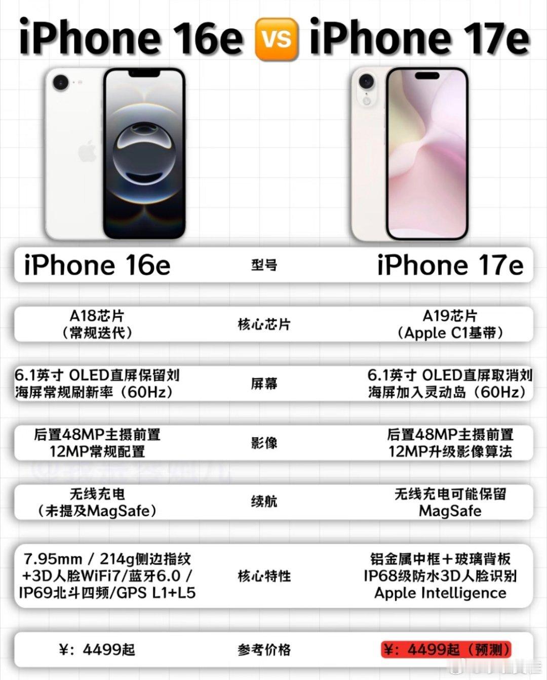 苹果最便宜新机要来了iphone 17e要来了,除了常规的芯片迭代。外观取消刘海屏加入灵动岛,也算是正面屏幕一大变化。背面依旧是单摄像头的玻璃背板。总体看来升级并不大