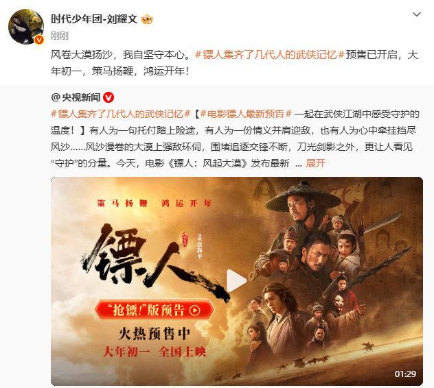 刘耀文邀你共闯浩荡江湖 刘耀文风卷大漠扬沙我自坚守本心刘耀文风卷大漠扬沙我自坚守本心,刘耀文邀你共闯浩荡江湖,期待住影院和和我们耀文的武侠江湖故事的见面啦~2026春节档电影时长