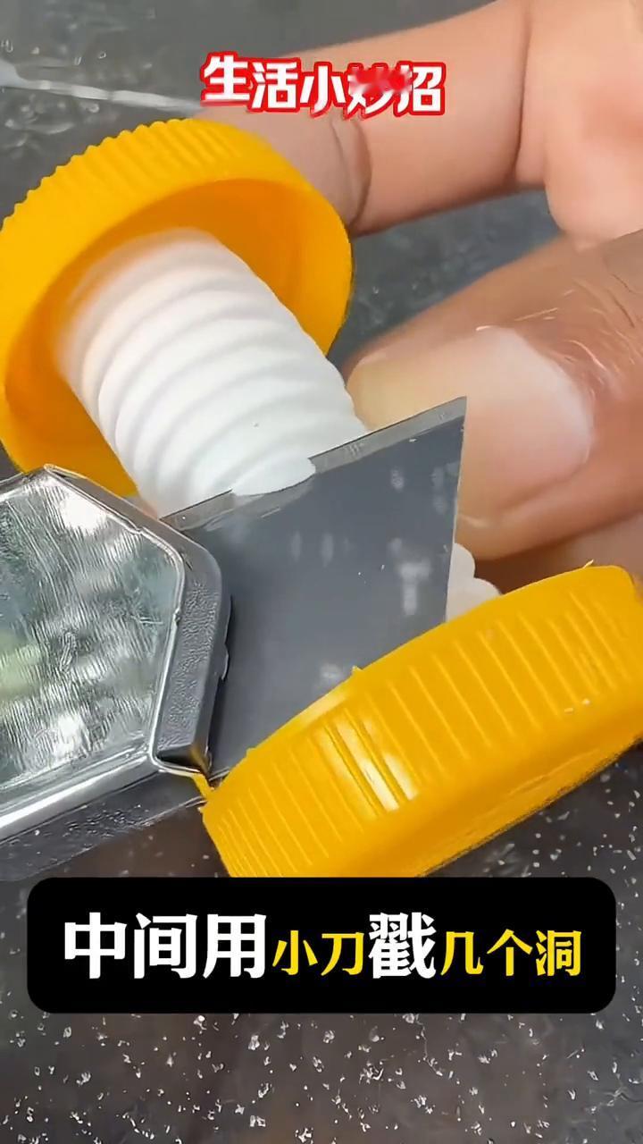 生活小妙招你一定不知道。 活了40年才知道这些生活小技巧,看完保证让你不吃亏。 ·第一个注意看,将一个大的瓶盖固定在铁门上,用小刀把它从中间切开,将门锁锁起来之后把瓶子拧上去,这样就可以避免铁锁生锈了。 ·第二个木板上粘块锡纸,放上梅花扳手,再喷点食用油,接着往里面打上热熔胶,放上螺丝,等它凝固之后就得到了一颗可以用手拧的螺丝了。 ·第三个准备两个塑料瓶盖,再剪一根洗衣机的排水管,瓶盖固定在上面,中间用小刀戳几个洞,再把它固定在门后面,开门的时候就不会撞墙了。 ·第四个想吃罐头打不开,只需要在碗里面倒点热水,把罐头倒立在碗中1分钟时间,这样老人和小孩想吃罐头了就能轻松拧开。 ·第五个灯泡不亮了先别扔,首先将一节电线对折,接着对灯泡里的灯柱进行短接测试,当短接到哪个灯珠突然亮起来了,说明这个灯珠烧坏了。将其拆下来,找一个药片壳用火烧一下,剪下来一块小铝片粘贴在胶布上,然后把它粘贴在拆除的灯珠位置,这样就可以修复烧坏的灯泡了。 ·第六个线头留短了可以这样打结,把长的线绕在剪刀上,再用剪刀把短的线夹住,长线往剪子尖方向送下来,这样再短的线也能系起来,用同样的方法再打一次结就可以了,是不是超级简单? ·第七个假酒真酒只需要一勺食用油就能轻松测试,两个杯中分别加入一勺花生油,拿筷子像这样搅拌一下,纯粮食酒搅拌之后都会融合在一起,酒精兑的酒不会和油融合,学会这招以后再也不怕碰到假酒了。 ·第八个空调内机漏水其实是因为外机的排水管里面有脏东西给堵住了,可以把排水管插进装满水的瓶子里,再拿胶带密封好,然后快速的挤压瓶子,这样管道里的脏东西全部都会吸出来了。