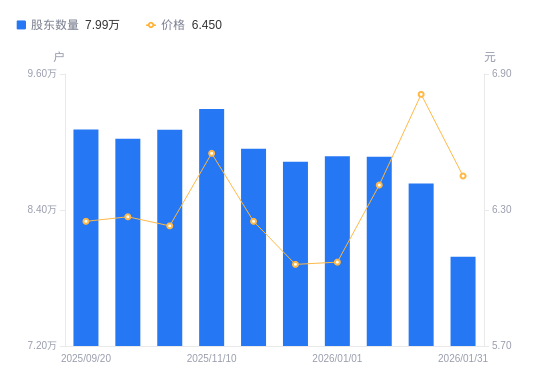 日期A股户数(户)流通A股户均持股数(股)户均持股市值(万元)2026-01-317988222079.1014.242026-01-208633620428.5913.912026-01-108870719882.5712.742026-01-018873919875.4012.062025-12-208826519982.1312.112025-11-308939419729.7712.332025-11-109291318982.5212.432025-10-209108519363.4812.062025-09-309029519532.9012.252025-09-209110419304.9012.07
