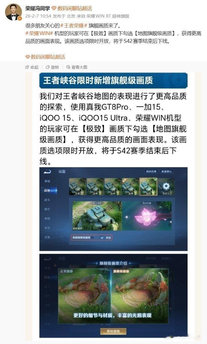 需要注意的是,该画质选项限时开放,将于 S42 赛季结束后下线。另外,荣耀游戏研发工程师 冯同学 分享的图片显示,支持《王者荣耀》地图旗舰级画质的机型还包括 realme 真我 GT8 Pro、一加 15、iQOO 15、iQOO 15 Ultra。