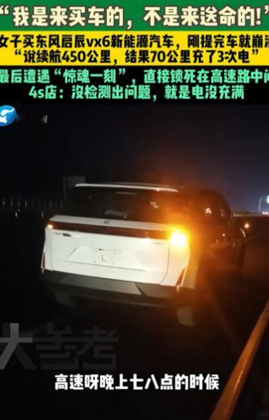 “我快吓死了!”河南郑州,女子买了一台新能源汽车,提车当天,喜滋滋的到店里,把电量充到97%后就准备上高速回家,万万没想到,说好的续航450公里,结果仅跑了70公里就充了3次电,甚至还在高速上趴窝,女子彻底破防了:我是来买车的,不是来送命的! 张女士今年三十出头,在郑州一家培训机构上班,平时通勤不算远,但经常要往返周边城市。油价居高不下,她早就动了换新能源车的念头。 看了好几个月,对比了配置、价格、续航,最终选中了东风启辰 VX6——门店宣传得很诱人: 续航450公里、空间大、家用实惠,城市通勤加偶尔跑高速完全没问题。 提车那天,张女士特意请了半天假。 销售员把车擦得锃亮,车头还系着红丝带。她围着新车拍了好几张照片,发了朋友圈:“人生第一辆新能源,开启新生活。” 交接手续办完后,销售员建议她先在店里把电充满再走。 张女士也谨慎,站在充电桩旁等了一个多小时,眼看着电量一点点往上爬,最后停在97%。 “差3%无所谓了,销售说满电能跑四百多公里,我家离这也就一百多公里。” 她当时心里很踏实。 下午三点多,张女士上了高速。 新车开起来很安静,方向盘也轻,她还特意留意了一下仪表盘上的剩余续航:430多公里,心想这钱花得值。 可跑了没多久,她就觉得不对劲了。 先是续航数字掉得特别快。 刚上高速没多久,明明才跑了二十多公里,续航却一下少了将近七十公里。 “我还以为是显示延迟,没太当回事。” 直到低电量提醒第一次跳出来,她才有点慌。 张女士赶紧找最近的服务区,插上快充。 十几分钟,电量勉强充到能继续跑,她安慰自己: “可能是新车第一次跑高速,系统要适应。” 结果刚开出去没多远,第二次低电量报警又来了。 这一次,她的心彻底悬了起来。 高速上车来车往,旁边货车呼啸而过,仪表盘却一遍遍闪红提示。她一边盯着路况,一边不停刷新导航,生怕下一个服务区距离太远。 短短70公里,她前前后后充了3次电。 最让她崩溃的,是第三次。 那会儿天色已经暗了,高速路灯还没完全亮起,车速刚提到八九十,突然—— 动力明显下降,车子开始“发虚”。 “我踩电门,车却不怎么走了。” 紧接着,仪表盘直接跳出“动力受限”的提示。 张女士吓得手心全是汗,只能慢慢往应急车道挪。 车刚停稳,续航显示直接变成个位数。 她坐在车里,四周是飞驰而过的车流,心跳快得不行。 “那一刻我真的觉得自己不是买车,是在拿命开玩笑。” 情绪彻底崩溃的她,当场给门店打了电话。 电话那头,工作人员先是让她别着急,指导她联系道路救援。 等车被拖下高速,她人已经又累又怕,嗓子都哑了。 第二天,她带着车回到4S店,明确提出质疑: 宣传续航450公里,结果70公里充三次电,还在高速趴窝,这算怎么回事? 门店安排了检测。 张女士在休息区等了将近两个小时,工作人员出来后,却给了她一个让人难以接受的答复: “车辆检测没有发现任何问题。” “当时只是电量没有充满,所以续航显示不准确。” 这句话,直接把张女士气笑了。 “97%不叫充满,那多少才叫?” “难道我每次出门都得充到100%,还得祈祷它别‘算错账’?” 她反复强调,高速趴窝不是小事,这是安全问题。 可工作人员始终坚持: “车况正常,可能是驾驶习惯、路况、温度等因素影响。” 听到这里,张女士彻底寒心了。 “我能接受冬天打折、开空调掉电,但不能接受续航缩水成这个样子,更不能接受高速失去动力。” “我是来买车代步的,不是来送命的。” 事情被她发到网上后,很快引起了热议。 不少网友留言表示有类似经历,也有人质疑新能源车的实际续航与宣传差距过大。 截至目前,张女士仍在与门店协商,希望能给出一个合理解释和解决方案。 而她自己,也不敢再单独开这辆车上高速了。 “每次坐进去,我脑子里都是那天晚上趴在高速上的画面。” “那种恐惧,真的不想再经历第二次。”