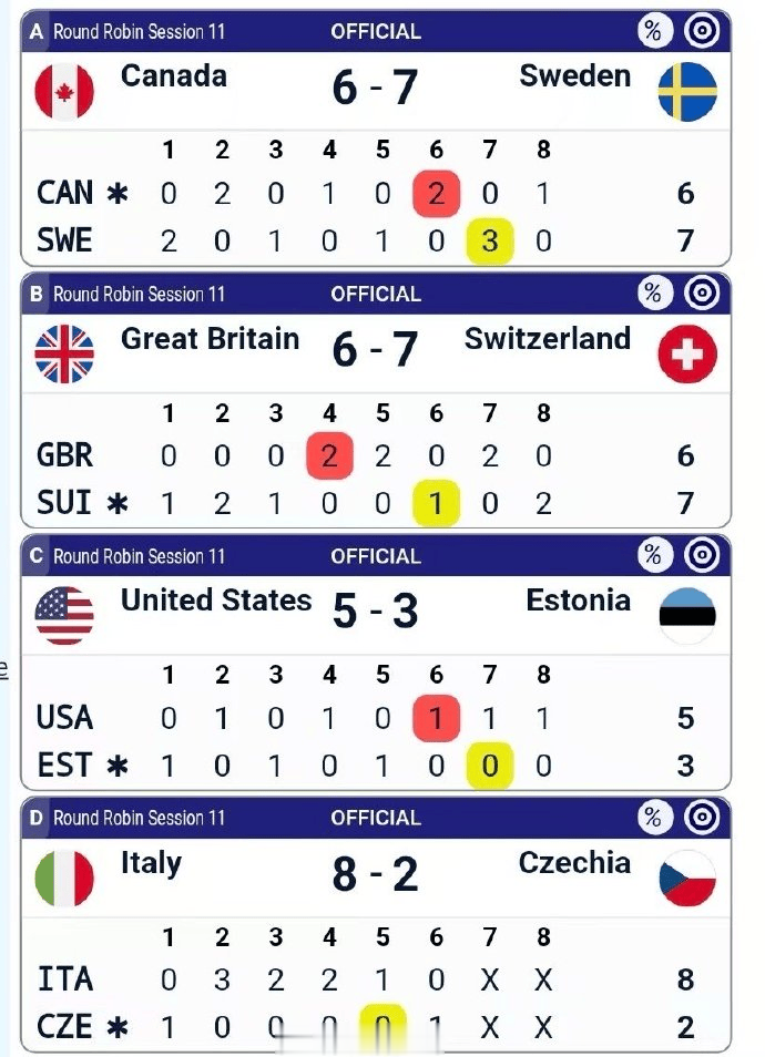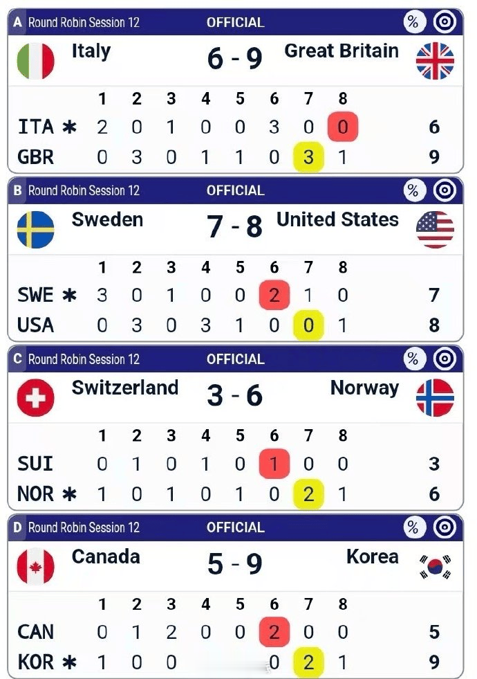 加拿大队在开局三连胜后意外遭遇五连败出局;韩国则在五连败后迎来三连胜。瑞士因胜负关系劣势(输意大利、瑞典)提前出局。