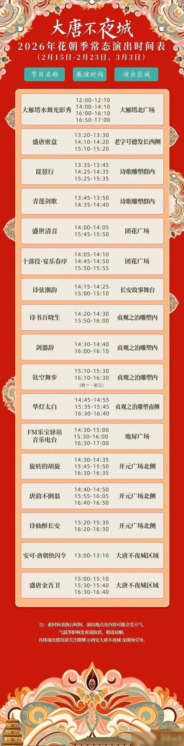 温馨提示:演出时间表执行时间、演出地点及内容可能会受天气、气温等影响变更或取消,具体演出情况请随时关注现场引导。