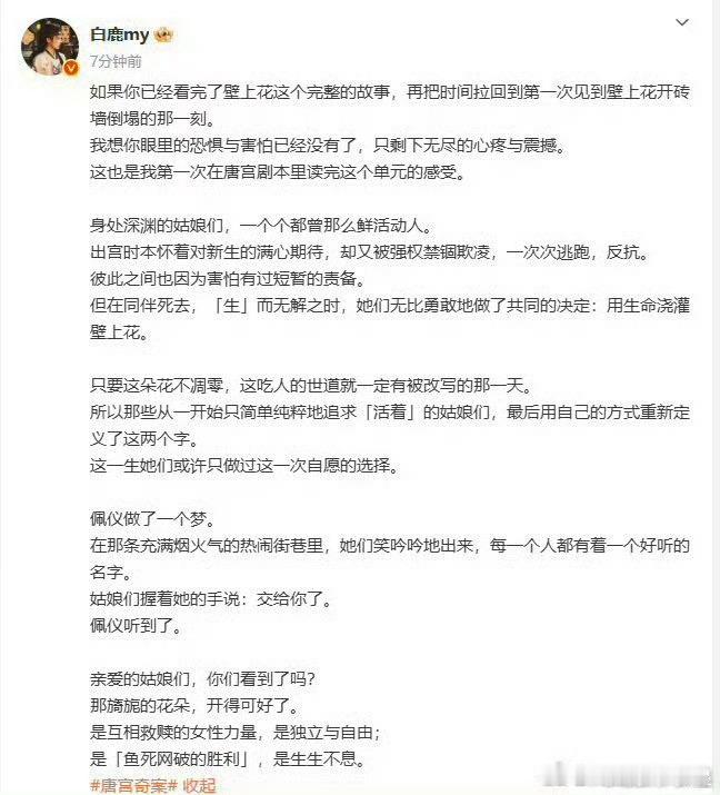 唐宫奇案 我的评分:白鹿长文谈壁上花唐宫奇案👖的《唐宫奇案》壁上花案满是女性力量,她们用生命浇灌希望,白鹿演活角色的隐忍倔强,共情力拉满