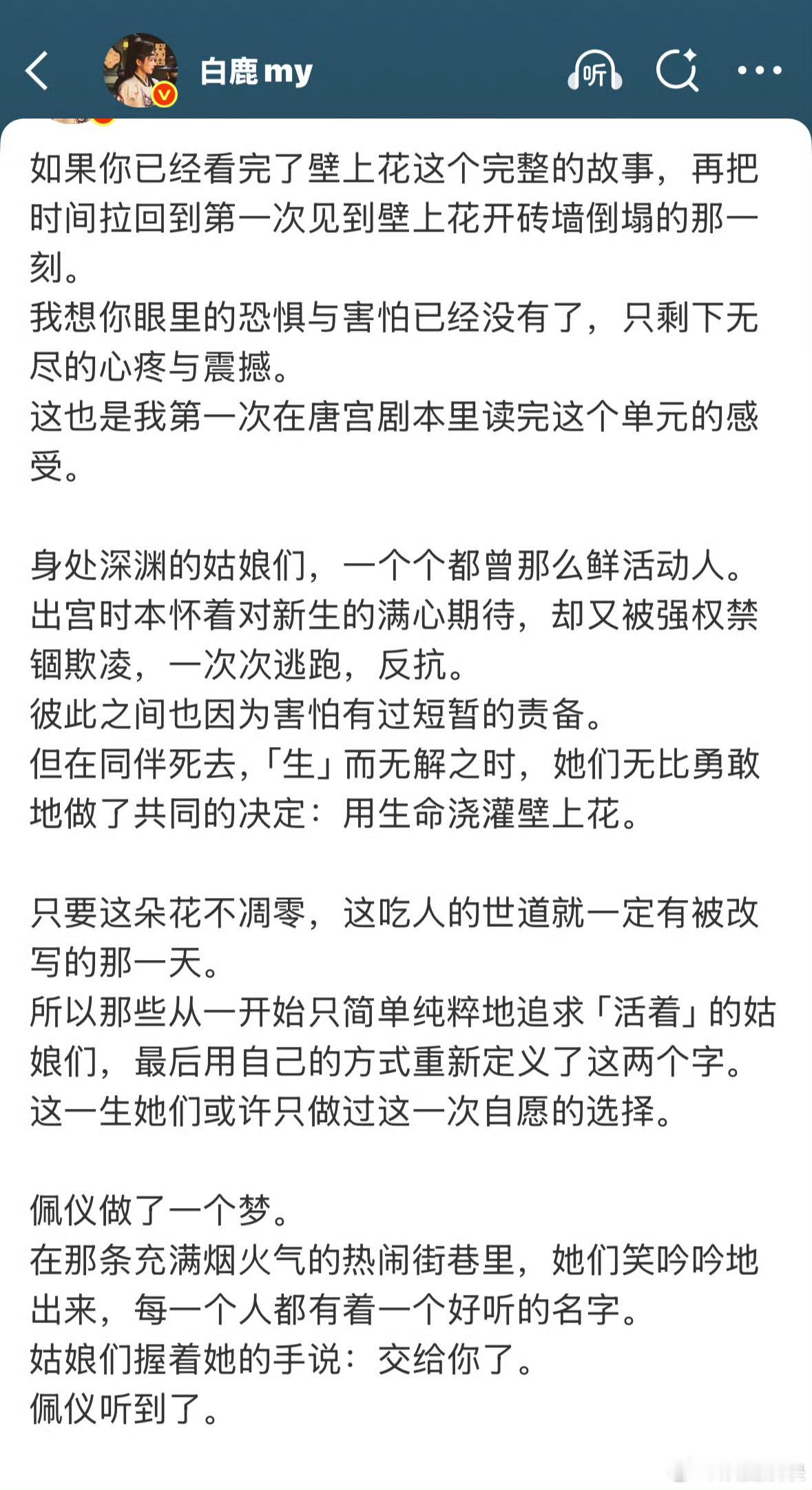 唐宫奇案 我的评分:白鹿长文谈壁上花唐宫奇案白鹿对“壁上花案”的解读太深刻了!百媚生的花语是“鱼死网破的胜利”,它代表了底层女性的生命力、被害者的无声证词。这个案子,已然封神。期待👖快快更新!