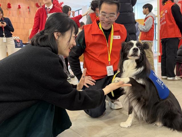 “哇,‘小家伙’来啦!”2月3日,上海德闳学校迎来一批特殊的访客——吴起和志愿者们携治疗犬“小家伙”“依依”、治疗猫“哈哈”和孩子们见面。课间时间一到,几只“毛孩子”迅速引起师生围观,有人蹲坐下来抚摸,有人试图与之握手、互动。吴起一边引导“小家伙”展示才艺,一边介绍这只边牧犬走南闯北参加影视剧拍摄的“战绩”,现场欢呼声和夸赞声此起彼伏。
