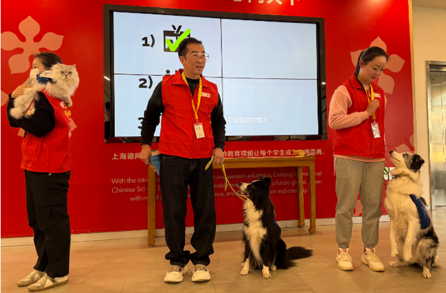 这并不是“小家伙”在这所学校的首秀。此前,上海德闳学校已将吴起的萌宠系列课程纳入本学期中学部的启迪课。每周一次的启迪课上,吴起和志愿者在治疗犬猫的配合下,进行动物行为学知识、人宠关系、生命教育等主题内容的讲授。