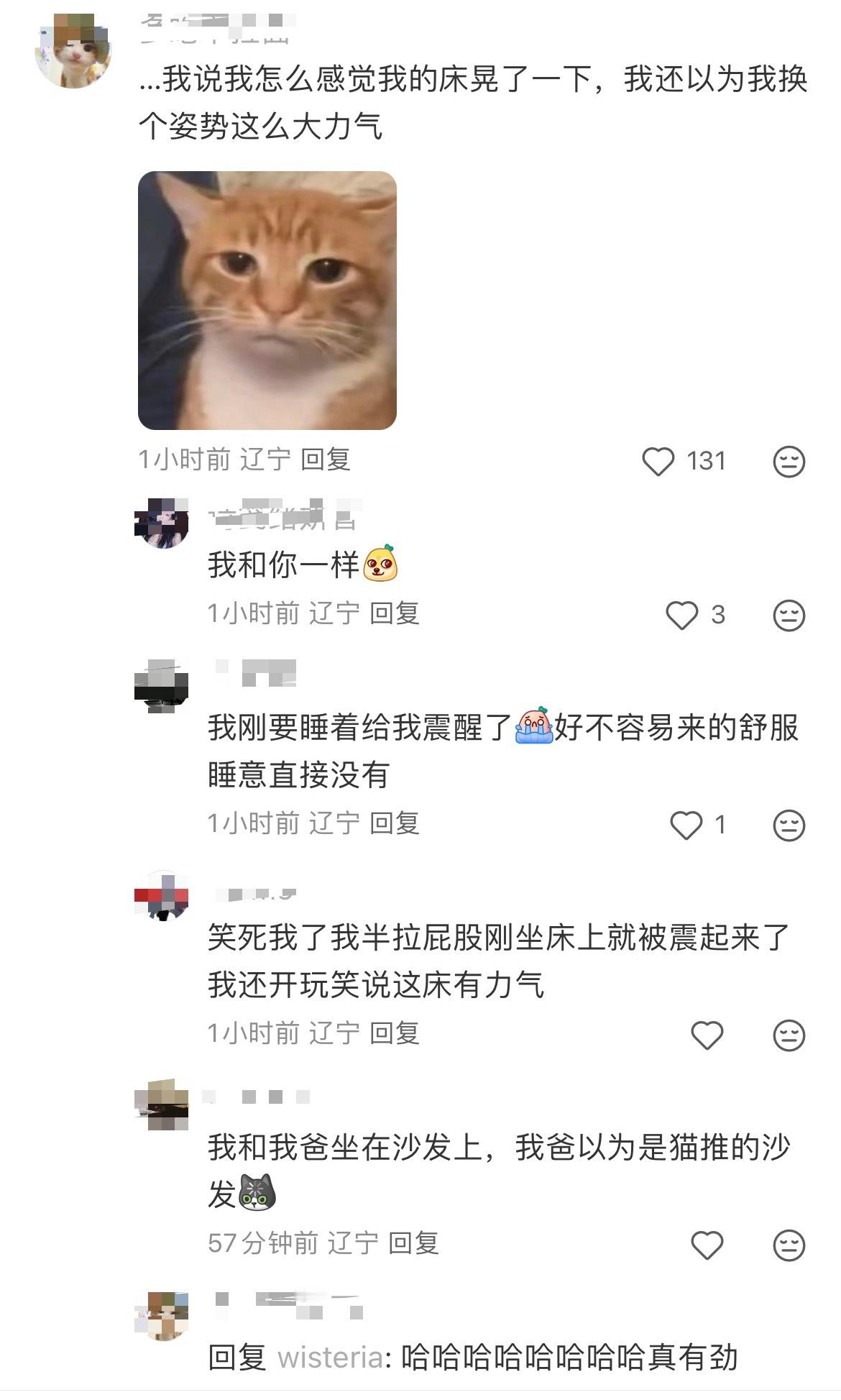 大连地震 最近这几天怎么这么多地震呀,评论里东北的朋友确实有幽默天赋,有怀疑自己翻身力气大的,有怀疑猫猫推沙发的,就是没人觉得地震了,但大家没事就好~