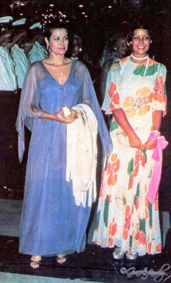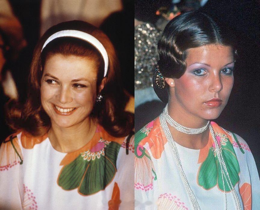 穿我的衣服吧 大概在70年代初期,摩纳哥王妃格蕾丝穿了一条像麻袋的白底大花裙子。其后借长女卡洛琳穿过两次,那会卡洛琳也就不到20岁,发型和妆容看着像40多的ps,图3格蕾丝戴的似乎就是个普通装饰性头饰,看不太清楚= =