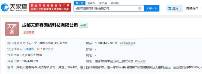 每经记者查询天眼查发现,成都天涯客成立于2024年4月29日,注册资本3000万元,法定代表人为林晓凤,注册地位于成都市青羊区万花三路。