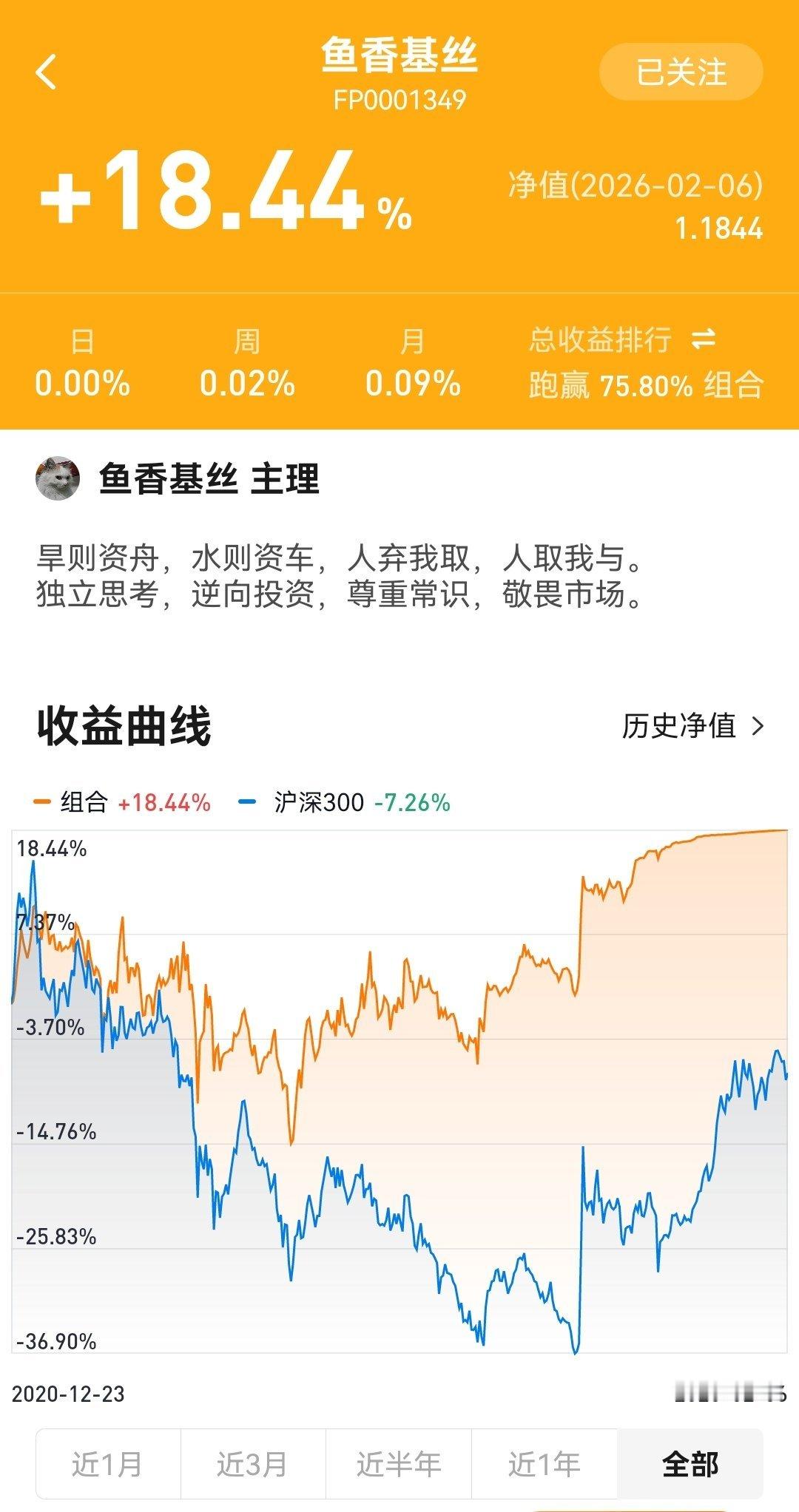 2026年2月6日鱼香基丝指数基金投资组合实盘周报成立以来场外组合收益率18.4