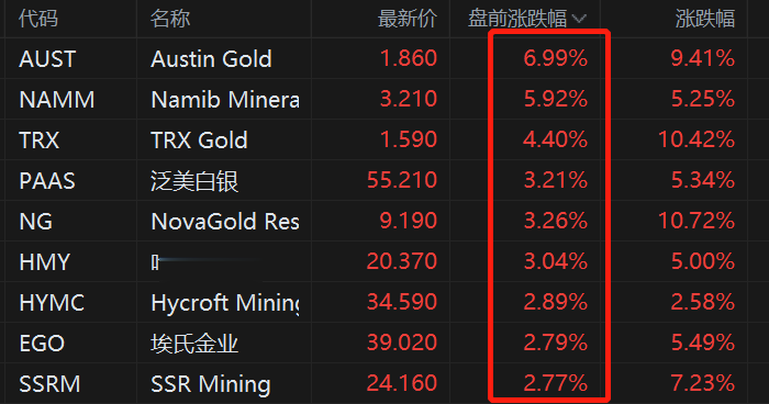 金银价格反弹,贵金属盘前集体拉升,AustinGold涨7%,NamibMinerals涨6%,泛美白银涨3.2%,哈莫尼黄金涨3%。