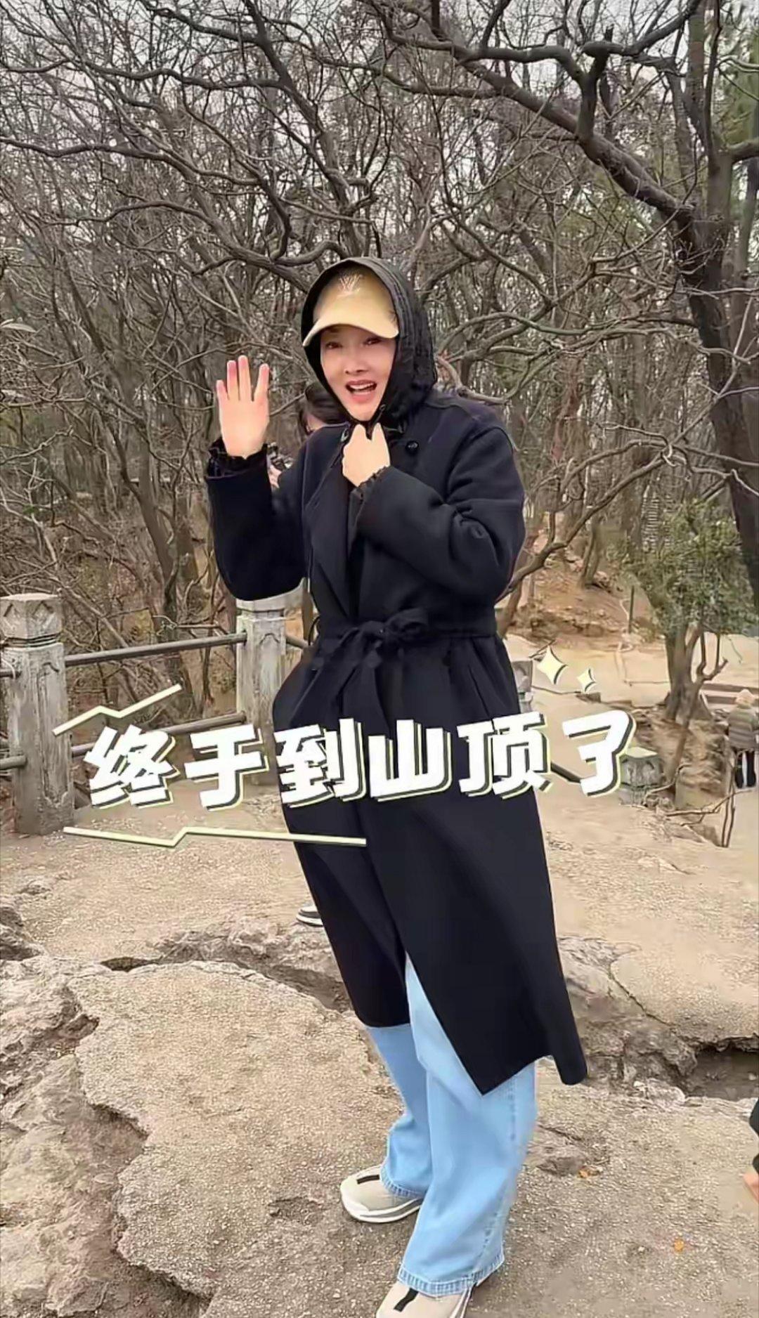 53岁牛莉爬山穿搭吸睛,黑大衣配棒球帽、牛仔裤,既时髦洋气,又舒适度拉满,状态超
