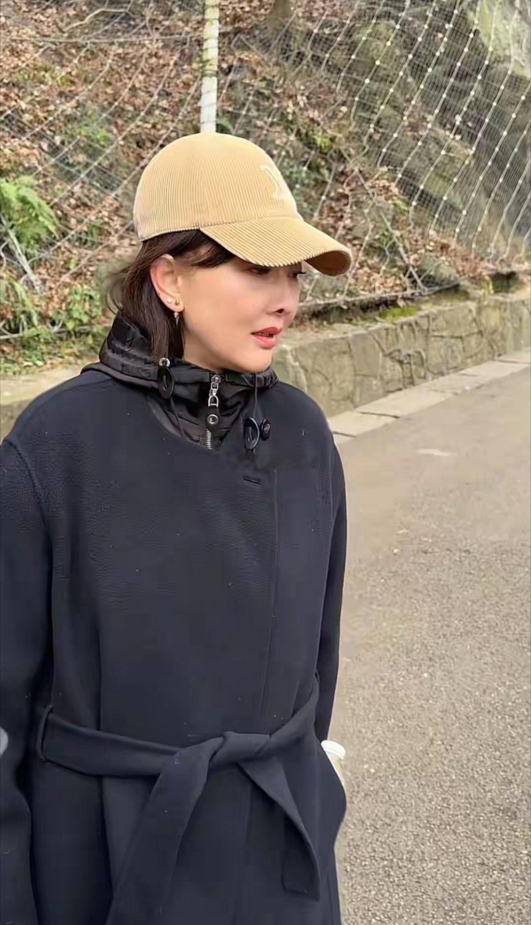53岁牛莉爬山穿搭吸睛,黑大衣配棒球帽、牛仔裤,既时髦洋气,又舒适度拉满,状态超赞。