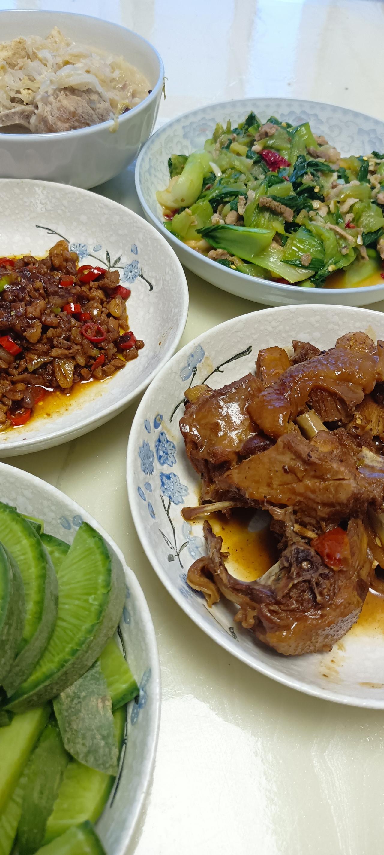 晚饭做了个干锅鸡,我老公赞不绝口,说好吃好吃! 我不喜欢吃鸡肉,基本一块都不动,好吃不好吃,我也不知道,他爱吃就好,因为就是特意给他做的。 还有沙窝萝卜,就炸了个肉酱。又做了个扒油菜,油菜特别便宜,九毛九一斤,比夏天都便宜,还挺好吃的。其实冬天多吃油菜好,它是蔬菜大棚里,用农药最少的蔬菜。 还有昨晚上的酸菜炖大骨头,剩下了就不愿意吃了,关键还有两块大骨头,扔了太可惜!就留着吧。 每天晚饭我家最少三个菜,养成习惯了,其实还真吃不了,有时候剩的都比吃的多。 我家王爷说一个菜两个菜有点单调,还是多做一个好。 他就是挑食的人,现在条件也好了,确实花不了多少钱,就是有点麻烦。 民以食为天!吃好喝好心情也好!开心就好吧
