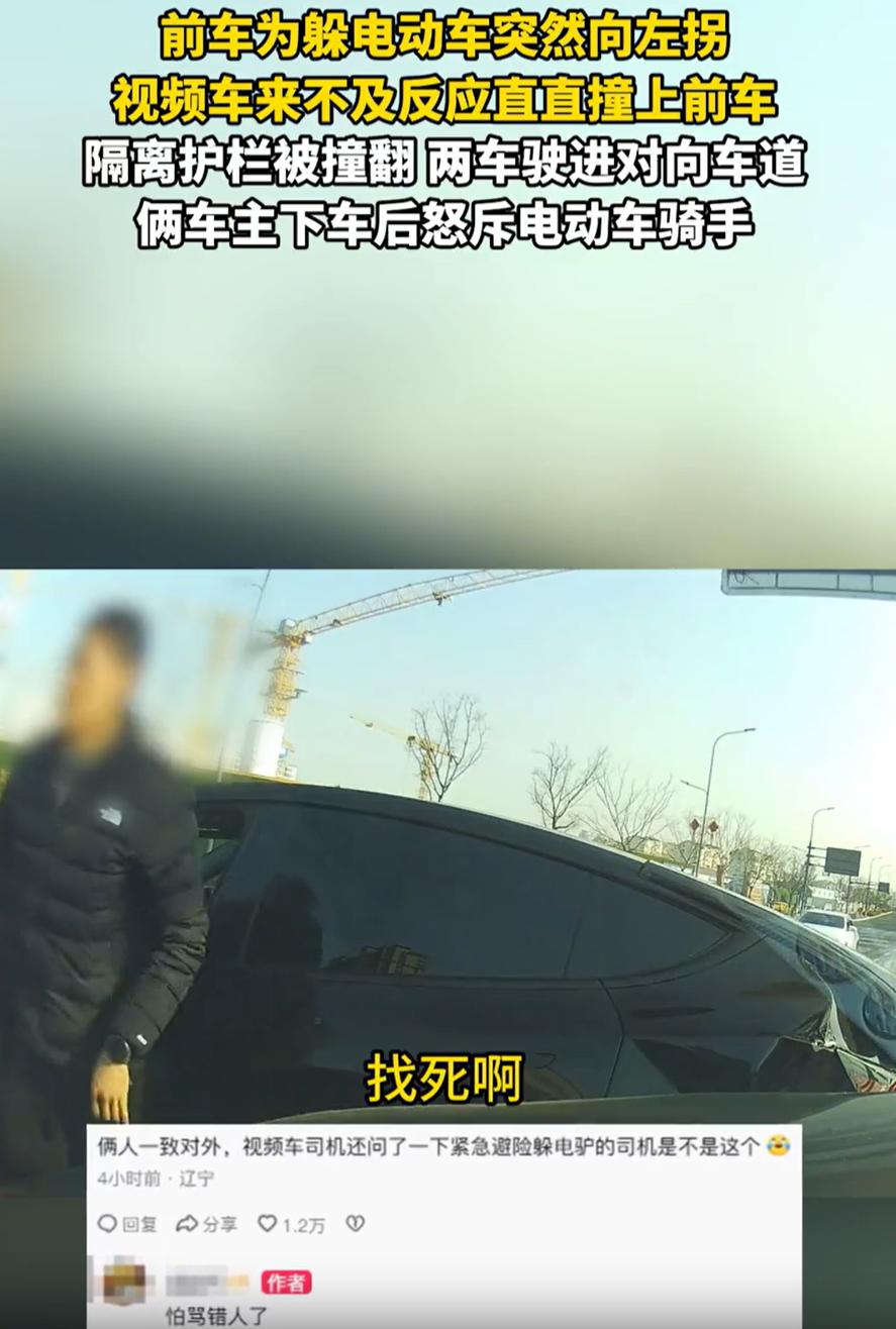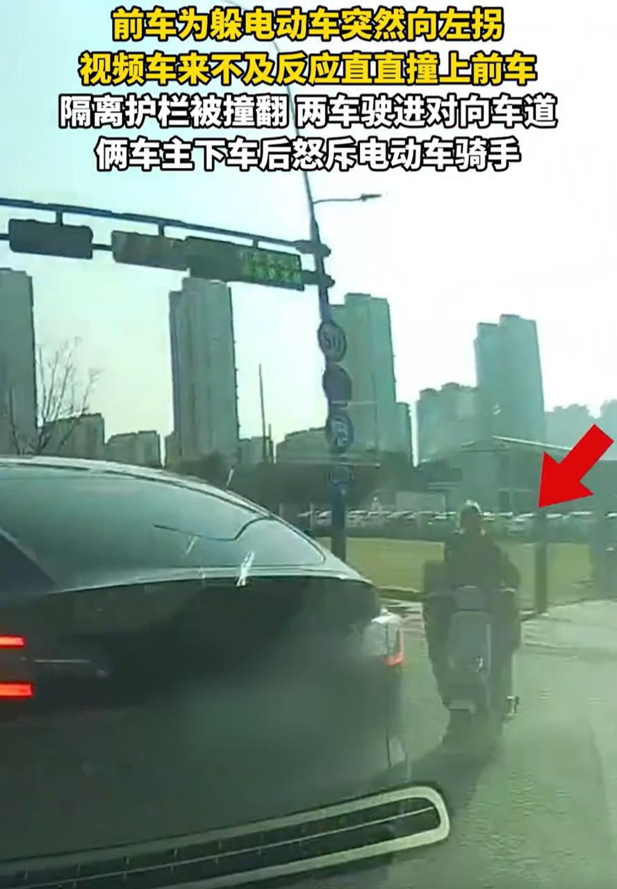 害人害己!江苏,一辆电动车闯红灯,刚好一辆黑车经过,为了躲避电动车只能猛打方向盘躲闪,结果却被后车追尾,而两名司机下车后,并没有互相指责,而是一同下车奔着电动车车主破口大骂,网友:骂得对! 根据后车的行车记录仪显示,当时两辆小车都在路上正常行驶,结果前面的黑车为了躲避闯红灯的电动车,突然踩刹车猛的一下左拐,视频车躲闪不急,直直的撞了上去,隔离护栏被撞翻,两车驶进对向车道 还好车上的人都没有大碍,随后两人也是把气都撒在电动车的车主身上,有意思的是,后车还跟前车司机确认了一下电动车司机,生怕自己骂错了人 有网友说:这种情况下,黑车应该原车道减速,而不是变道 这话理论上没错,可那种突发状况下,哪来得及想那么多?人一急,本能就是躲。要是他真不躲,恐怕电动车连人带车就得飞出去了 路上开车,最怕这种突然冒出来的情况。你守规矩开得好好的,总有人不守规矩,一个闯红灯、一个猛拐弯,就能把一整条道搞得人仰马翻。这次是两个司机运气好,只是车损,人没事。要是旁边刚好有别的车或者行人,后果更不敢想 这件事有意思的地方在于,两个被牵连的司机没互相怪罪,反而一起去找那个“祸头”。这说明大家心里都清楚,马路上很多事端,往往是一个人不守规矩引起的连锁反应 骑电动车、走路或者开车,其实都一样,上了路就不是你一个人的事。你一个闯红灯,别人可能就得急刹、变道,后面一串车都可能受影响。这次是追尾,下次万一有更严重的呢? 说到底,路上没有小事,每个动作都连着别人的安全。守规矩不是为了别人,恰恰是为了自己,也为了路上每一个陌生人。侥幸闯一次红灯,躲过一次处罚,看似赚了点时间,可一旦出事,害的可能不止自己