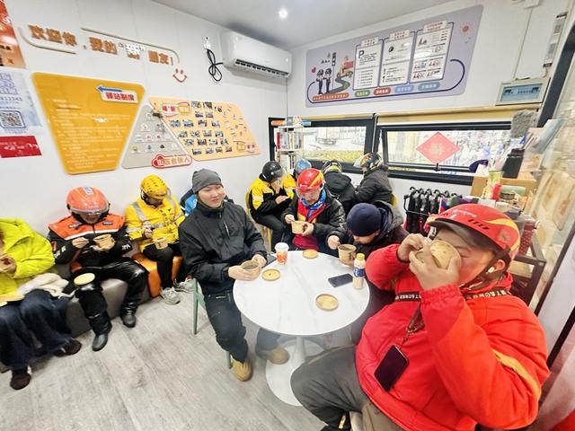 “以前这附近只能见缝插针停在路边,自己不方便,还挡着道。现在好了,咱都有专用车位,还能进来喝口水、歇歇脚,像个小家。”外卖骑手小王走进青浦宝龙商圈的“巷新驿站”,熟练地拧开保温杯接上了一杯暖姜茶。