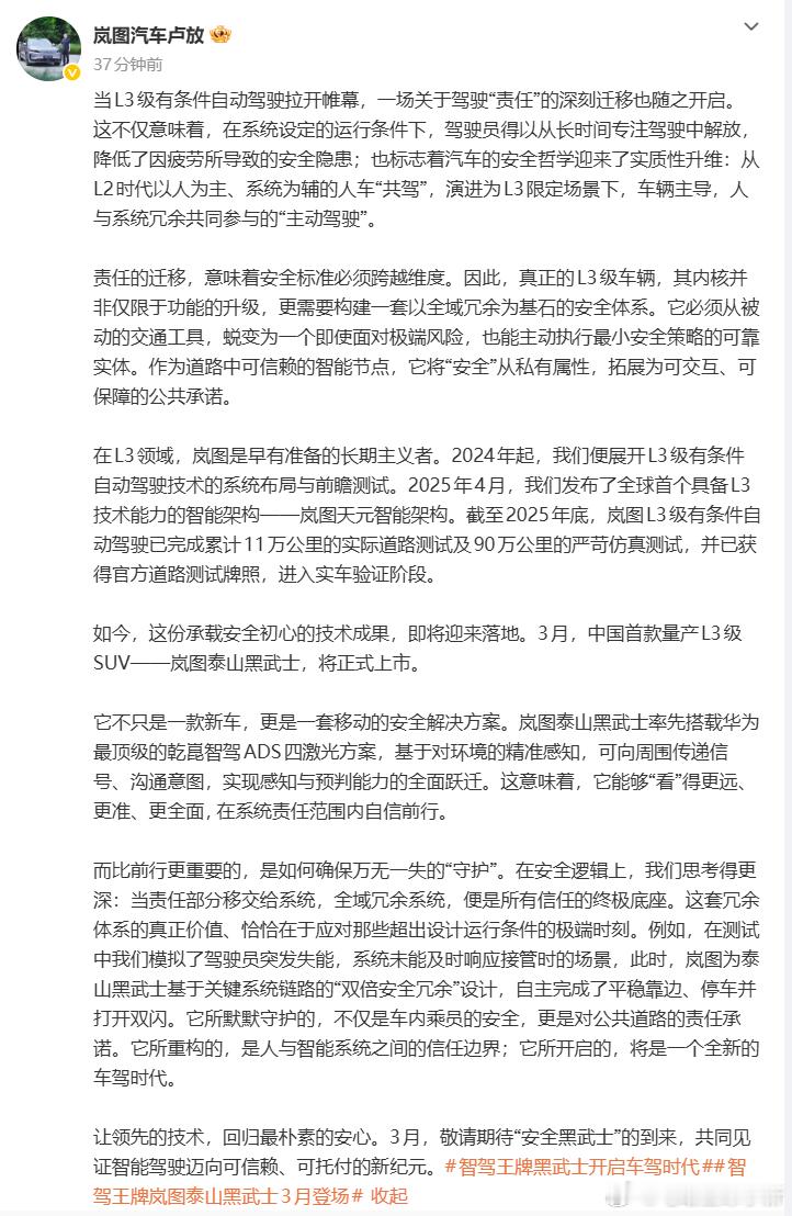 中国首款量产L3级SUV将上市岚图泰山