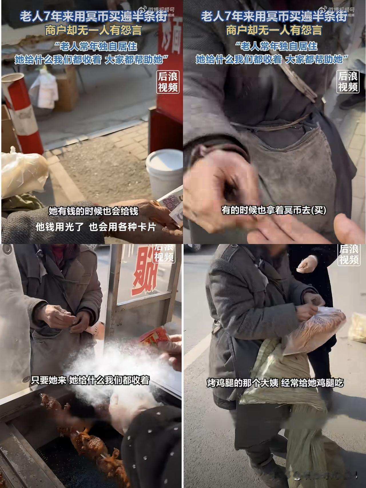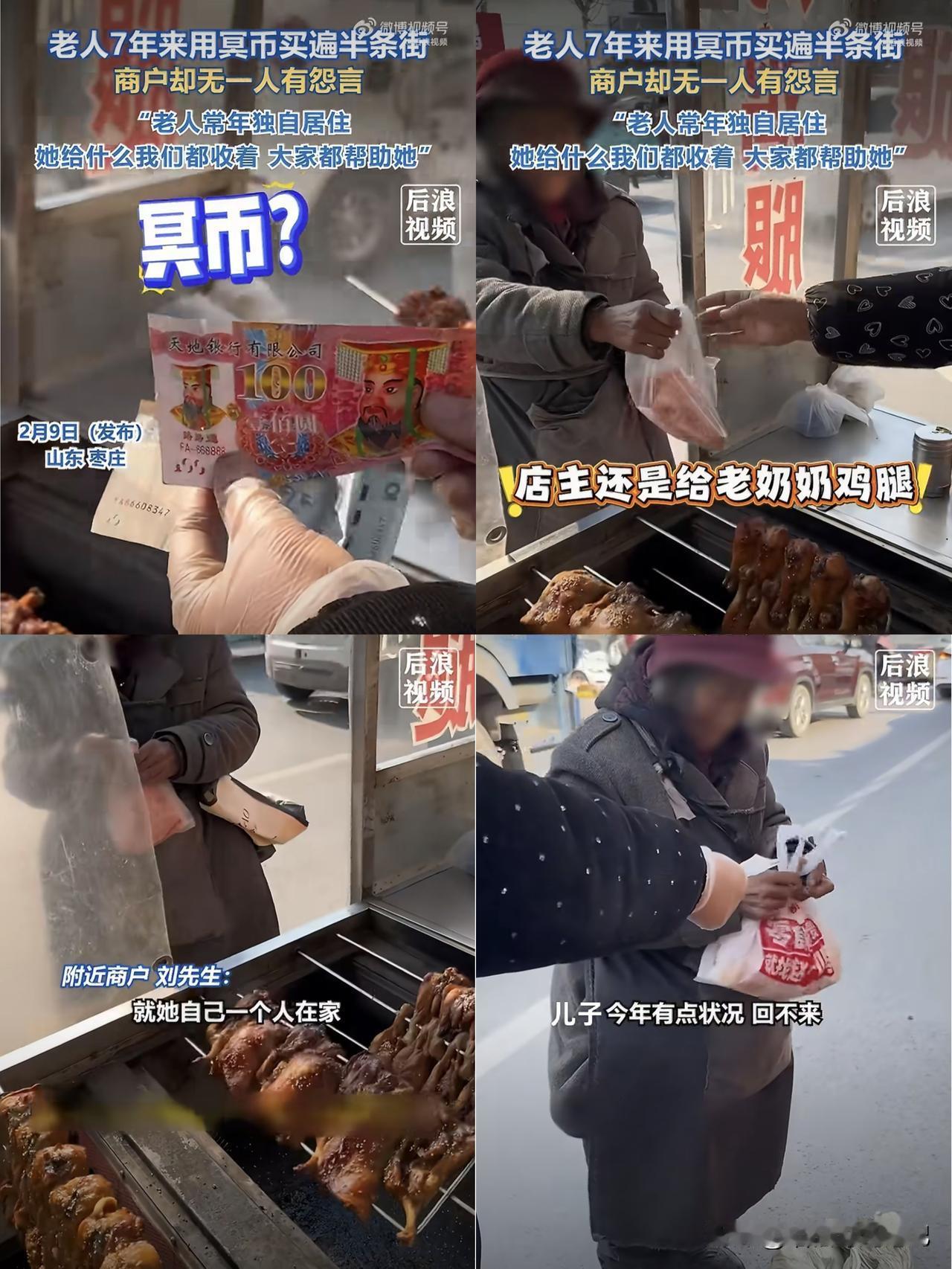 山东枣庄一条小吃街,70岁老奶奶连续7年拿冥币、玩具币甚至卡片"买"吃的。 老奶奶精神不太好,儿子今年回不来。有钱时她真给,没钱时就掏"天地银行"的钞票。烤串摊刘老板说得实在:"身正不惧阴阳,不差她这一口。"旁边卖鸡腿的大姨、铁板烧的大姐,都默契地收她的"钱",给她热乎吃的。 7年,没人揭穿,没人嫌弃,没人报警。老奶奶递"钱"时腰板笔直,眼神认真,她要的不是施舍,是那份"我能买"的体面。摊主们收下的不是假币,是老人的尊严。 老奶奶给的是天地银行,老板卖的是天地良心。 这世上不缺聪明人,缺的是愿意"糊涂"的善良。 老奶奶手里的"冥币"确实买不了东西,但它"买"到了人性最金贵的部分。这半条街的老板,收的是"假钱",给的却是真金白银的人间温暖。 (图源:@后浪视频)