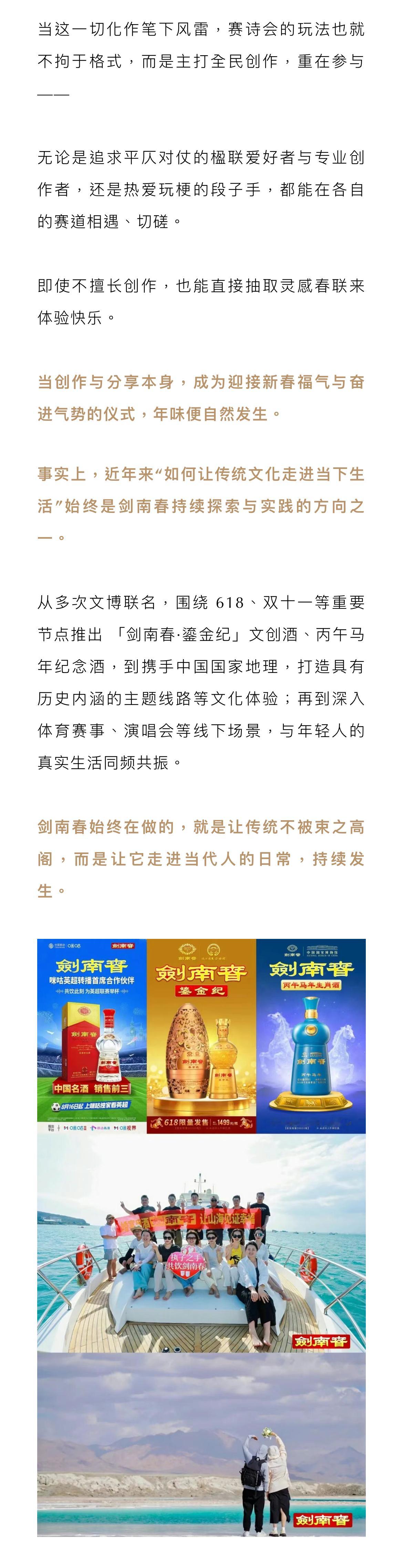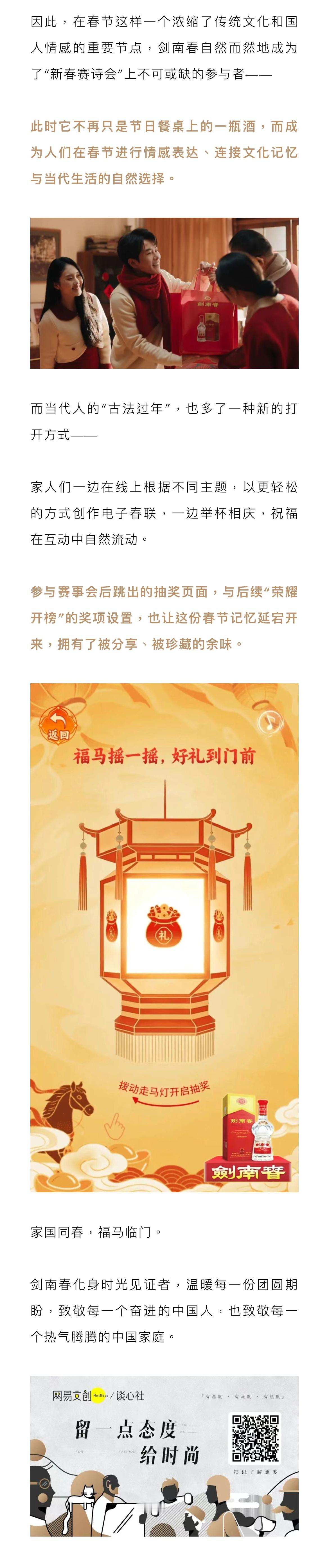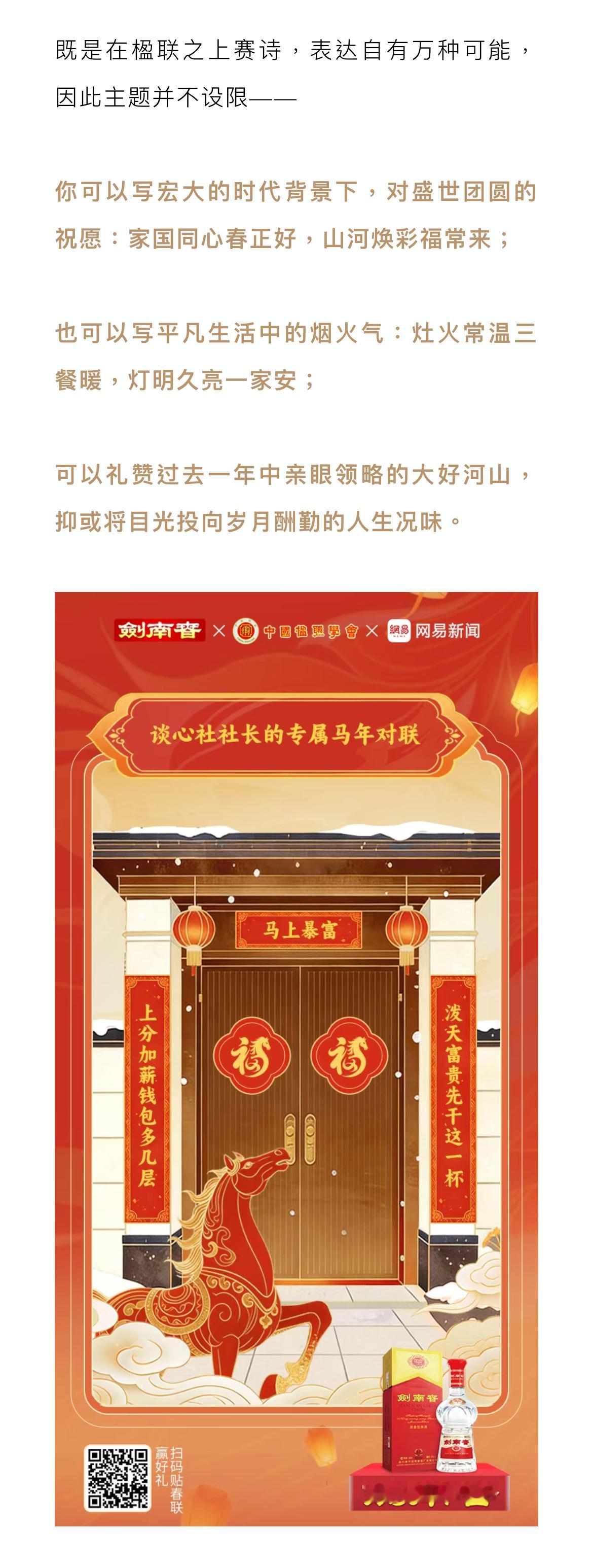 年轻人把古法过年玩出新高度!穿红装、围炉煮茶、写春联,把老祖宗的仪式感搬进日常~2026马年新春,网易 × 中国楹联学会发起「新春赛诗会」,家国同春 福马临门 邀全民写春联贺岁!作为承载千年宫廷御酒底蕴的剑南春,此次以“发榜人”身份重磅助力——用国家级非遗酿造技艺沉淀的品质,串联起传统年味与当代情感。不管是写盛世祝愿还是烟火日常,都能在笔墨间感受文化重量,举杯