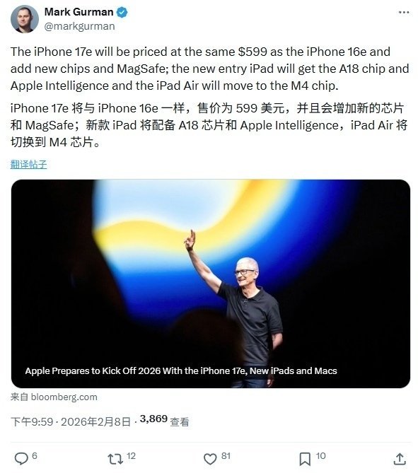 彭博社记者 Mark Gurman 在最新一期《Power On》时事通讯中提到,未来几周内苹果将陆续推出 iPhone 17e、新款 iPad 12、 iPad Air 8 以及 M5 Pro / Max 款 MacBook 新品,同时软件也将迎来 iOS 26.4 与 macOS 26.3 等关键节点。
