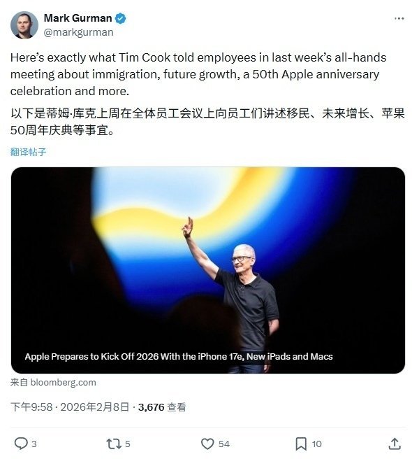 本期《Power On》的另一部分聚焦于库克在一次公司全员会议上的发言。库克主要讨论了创纪录的假日季业绩、AI、未来产品类别、新兴市场、行业内存短缺、移民问题以及苹果即将到来的 50 周年纪念。