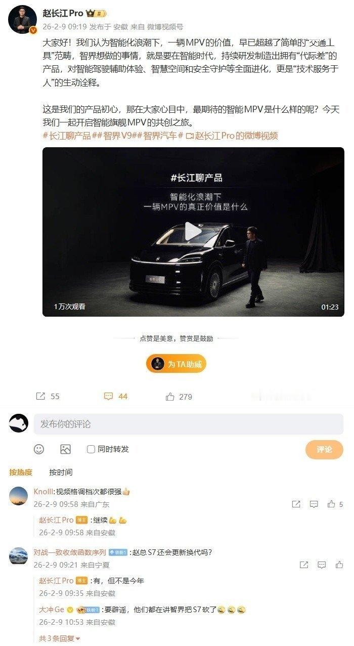 有网友就“智界 S7 是否还会更新换代”这一问题向智界汽车执行董事及执行副总裁赵长江求证,对方明确表示:“有,但不是今年。”该回复直接将谣言击碎,表明智界 S7 将正常迭代。