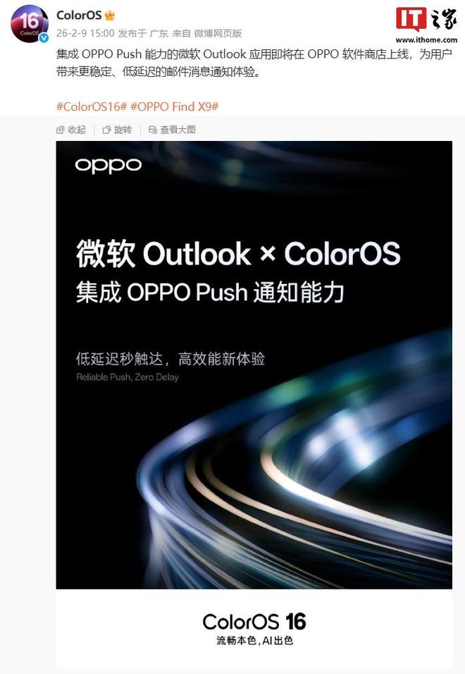 IT之家2月9日消息,OPPOColorOS官方微博今日宣布,集成OPPOPush能力的微软Outlook应用即将在OPPO软件商店上线,将带来更稳定、低延迟的邮件消息通知体验。