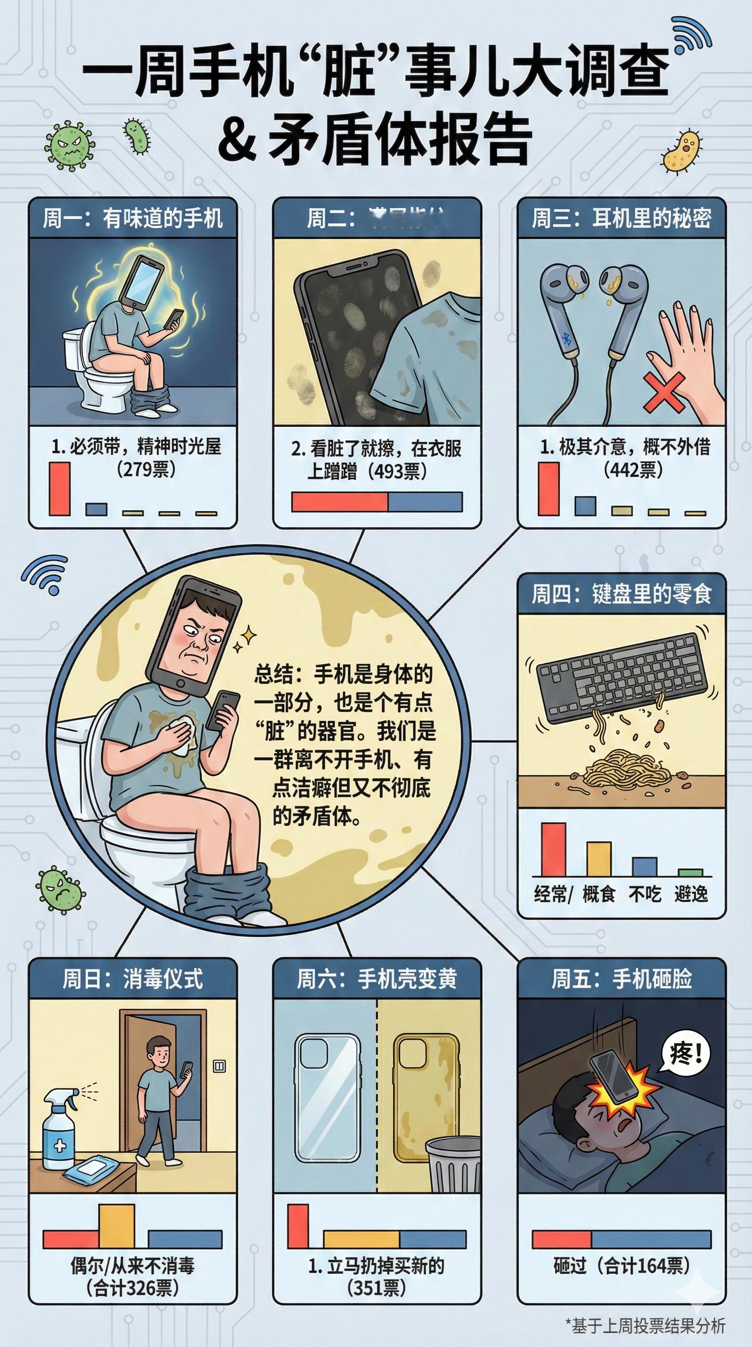 从上一周的投票结果来看,手机早就成了咱身体的一部分,甚至是个有点“脏”的器官。绝大多数人把厕所当成精神避难所,机不离手,但对卫生这事儿其实挺双标:屏幕脏了大多随便在衣服上蹭蹭,回家也很少专门消毒。