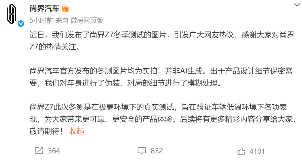 颤抖吧各位!!!!!!尚界汽车尚界汽车辟谣冬测图片为ai生成新能源汽车大v聊车