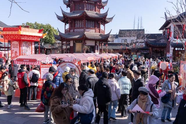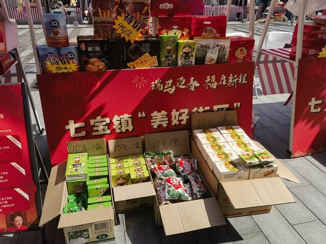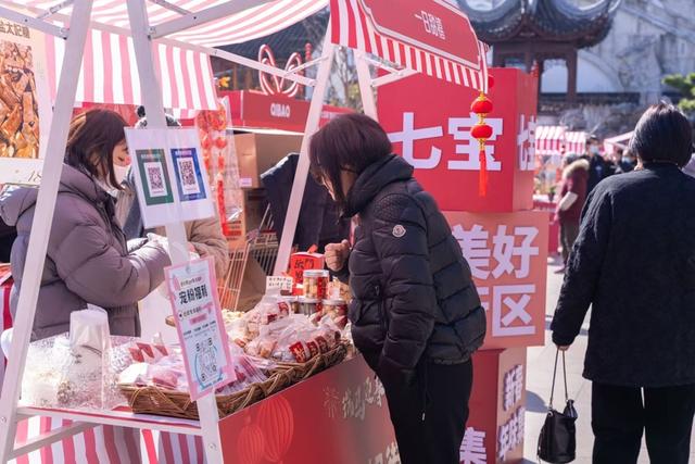这是七宝镇“美好街区新春年味集”的现场之一。据悉,今年,七宝镇党群中心、综合党委充分发挥“党建引领”核心作用,联动7大街区党支部,并协同古镇公司等单位,集结各街区的众多优质商铺,在明谷科技园、七宝老街、万金中心3大热门场地,连续推出三场新春年味集,不仅为返乡游子及市民备齐“舌尖年味”与“新春好礼”,更让本土特色手工匠人作品走进大众视野,有效激活了街区商业活力,实现多赢。