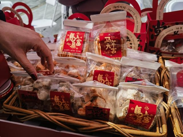 记者看到,现场30多个摊位门类丰富,既有面包甜点烘焙、新鲜水果、鲜花花艺、特色爆米花等,也有老字号年货礼盒、膨化食品、年货大礼包等专区,卤味休食、新鲜牛排、非遗美食等“硬菜”档口前还排起长队。与此同时,手织土布文创体验区前,小马玩偶土布作品也大受欢迎,融合七宝“七件宝”传说故事的系列文创更是被一些年轻白领买来作为伴手礼送亲友。