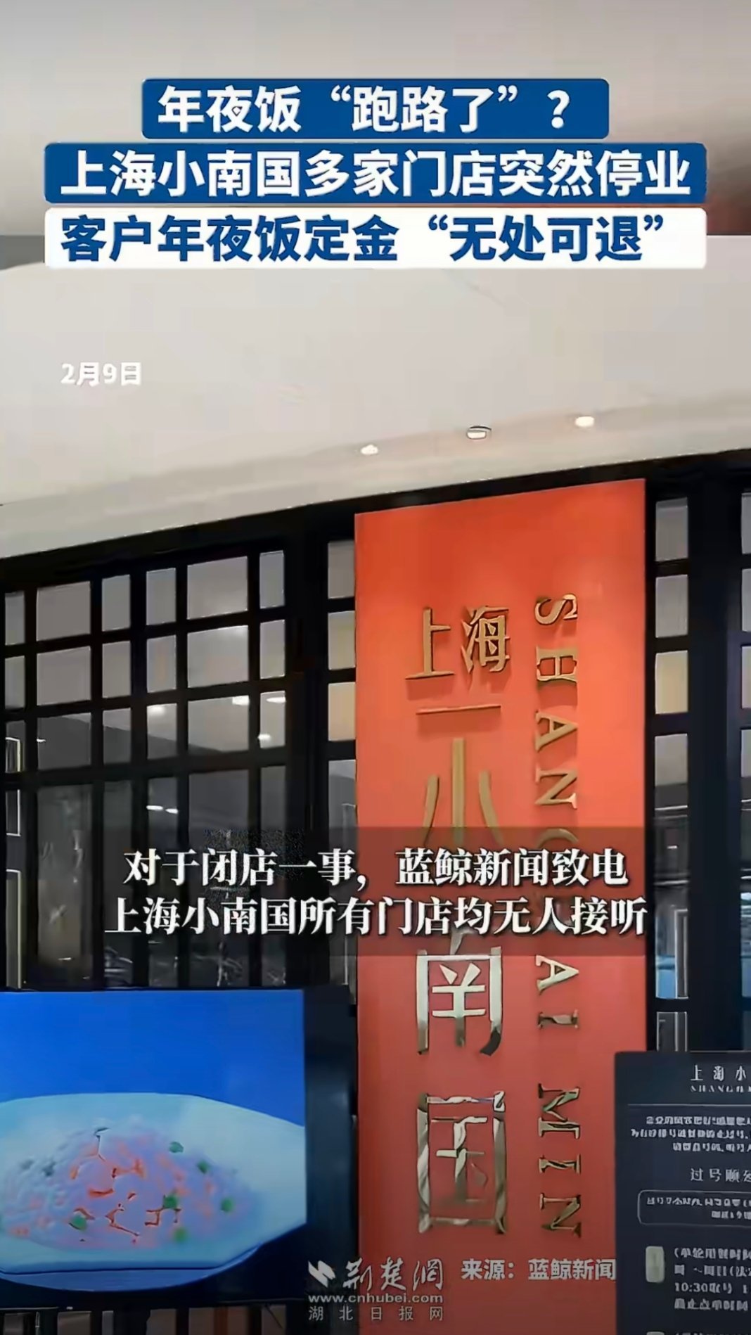 临近年关做年夜饭的餐厅跑路了小南国此前白菜价甩卖核心业务小南国这是什么操作?前脚刚10万美元白菜价甩卖核心业务,明摆着经营早撑不住了,后脚还照常接年夜饭预订收订金,转头就直接闭店,连个通知都没有,消费者的团圆饭泡汤,储值卡也成了废纸,甚至员工工资都被拖欠。三十年的老字号,靠本帮菜攒下的口碑,就这么被一波急功近利的操作败光了。说到底不是突然倒下,是早有预兆的经营问题,却偏偏拖着消费者一起埋单,连最基本的商业诚信都丢了。这次大家对预付消费、老字号品牌多了层顾虑,以后谁还敢放心订年夜饭、充储值卡?