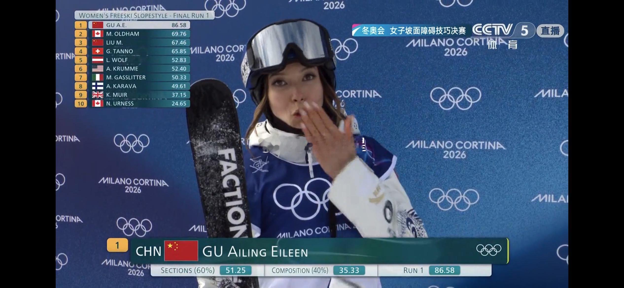 第一轮比完,谷爱凌直接就上难度。暂时排名第一。前两名真是断崖式领先。另外,现场有