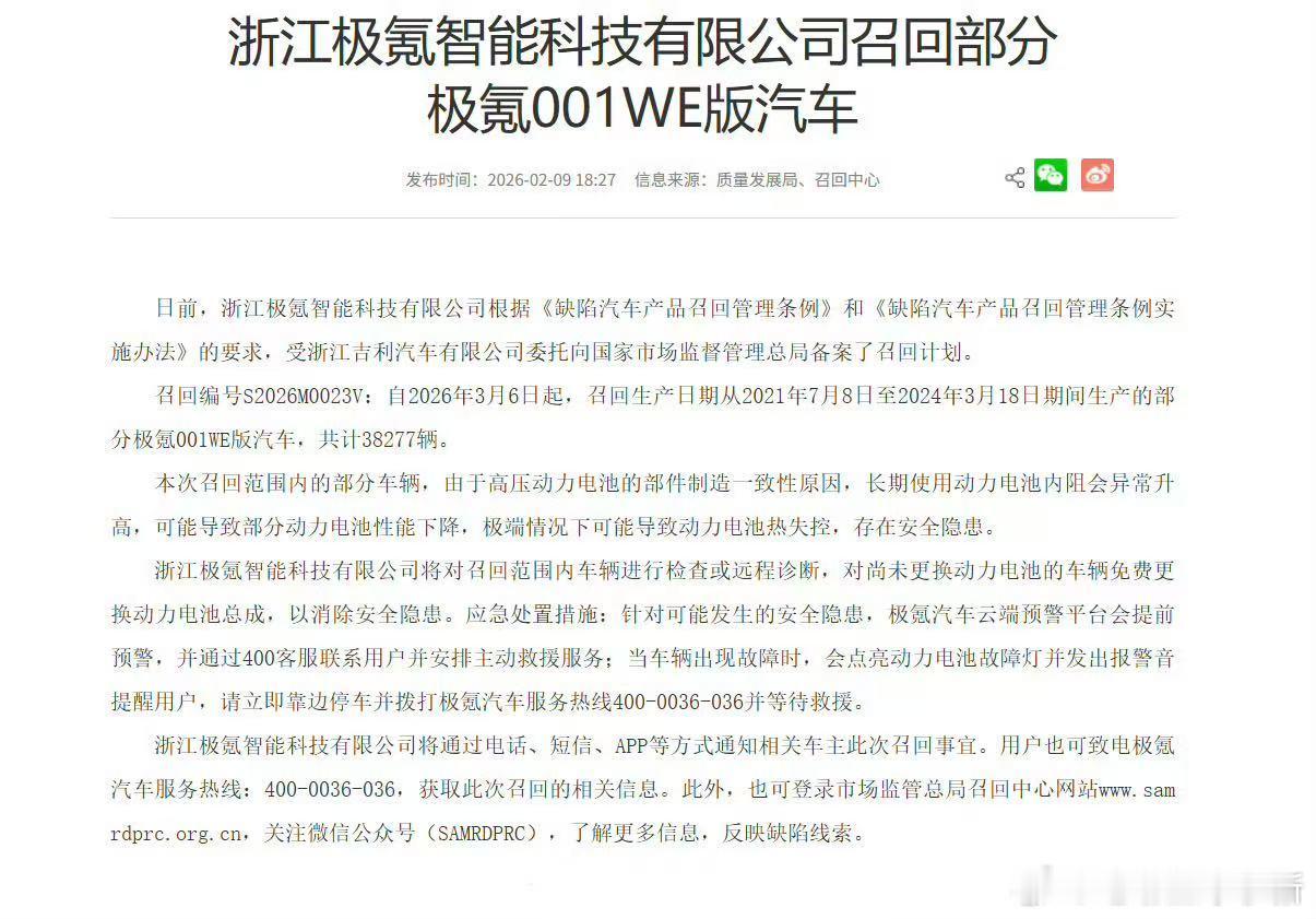 召回生产日期从 2021 年 7 月 8 日至 2024 年 3 月 18 日期间生产的部分极氪 001WE 版汽车,共计 38,277 辆。